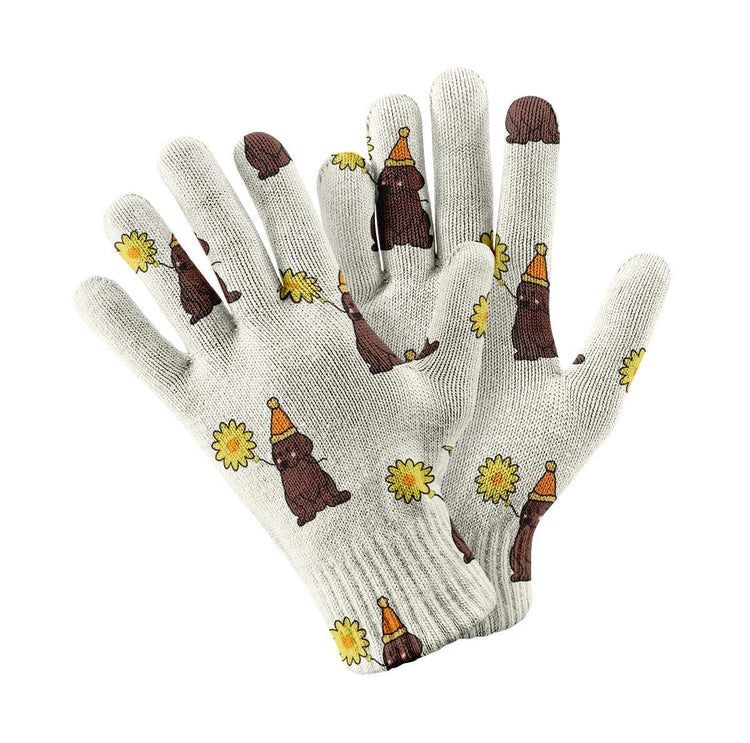 These charming gloves feature adorable Chocolate Labradors wearing orange hats and holding bright yellow sunflowers. Perfect for keeping your hands warm while staying connected with your touch screen devices.