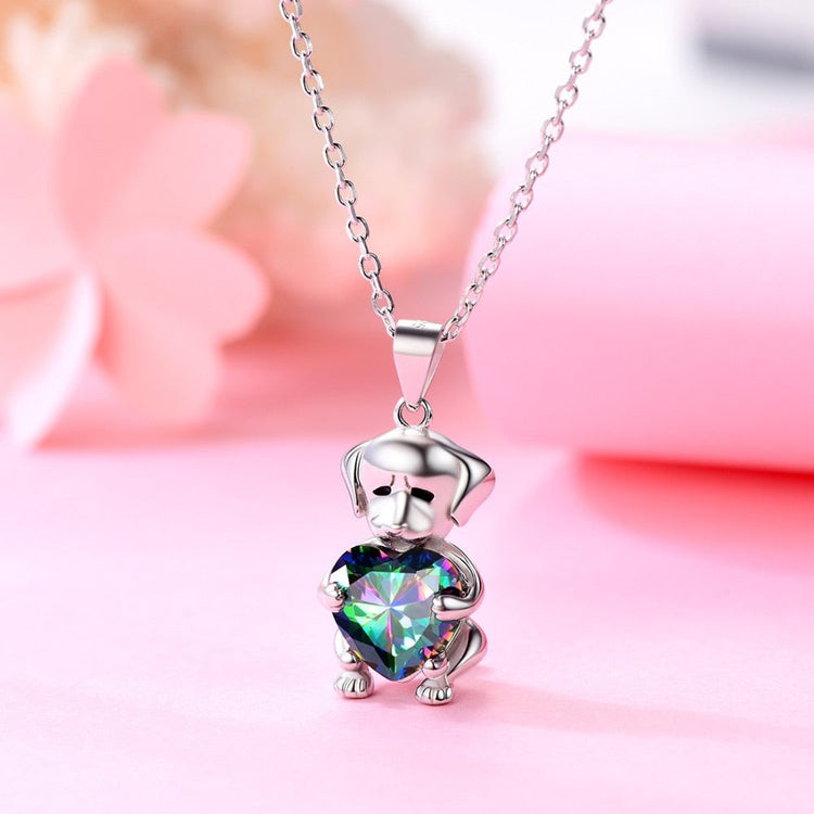 Made of 925 Sterling Silver, with a super-cute Labrador hugging a radiant heart-shaped Topaz stone design.