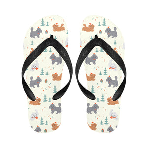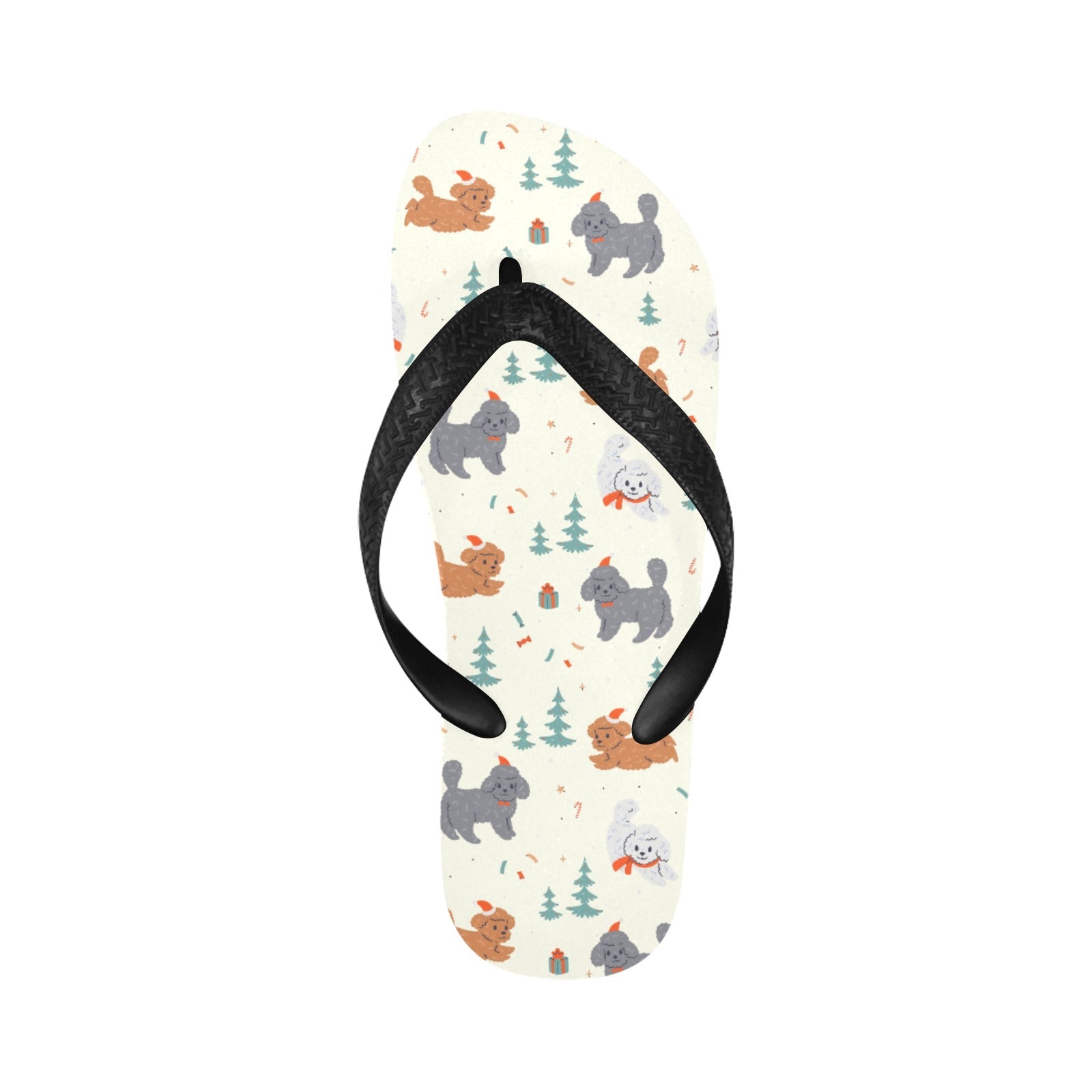 Embrace warmth and joy with playful Doodles adorned in Santa hats and cozy scarves. Surrounded by Christmas trees, candy canes, and twinkling stars, these slippers create a vibrant winter scene against a sleek background.
