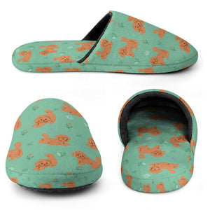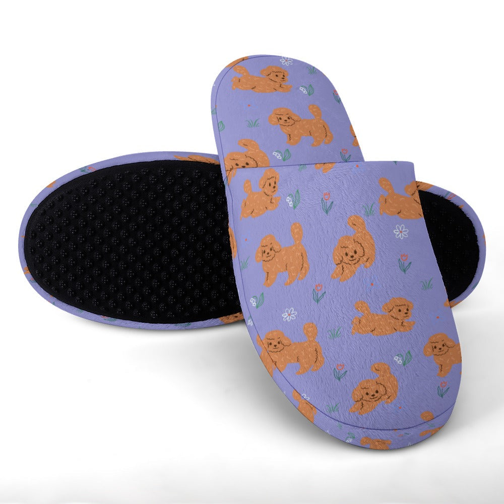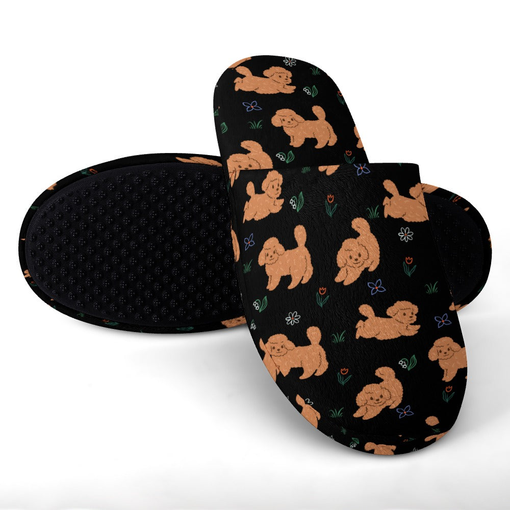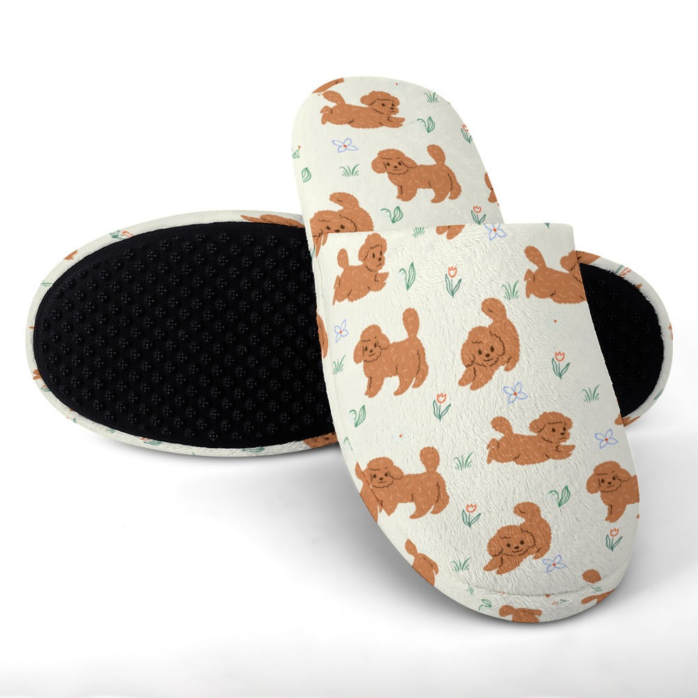 Designed to celebrate the joyful spirit of the Doodle breed, these slippers feature a delightful seamless pattern of playful Doodles amid vibrant floral motifs. Crafted with both your comfort and style in mind, they offer a snug fit that feels like a warm hug for your feet.