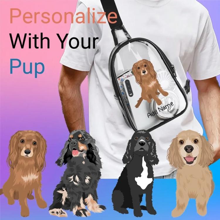 Celebrate your bond with a Personalized Cocker Spaniel Love Unisex Transparent Sling Bag. Customize it with your pup's likeness and name, capturing their true coat color for a heartfelt touch.
