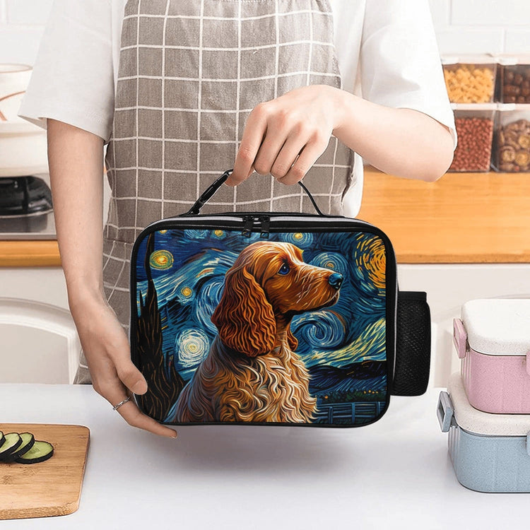This exquisite lunch bag features a captivating artwork that masterfully blends Vincent van Gogh's iconic "Starry Night" with the elegant silhouette of a golden Cocker Spaniel.