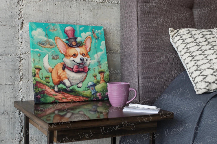The poster features a jubilant Corgi, adorned in a top hat and bow tie, soaring through a sky filled with fanciful flying machines and blooming ethereal flora. The expression of pure joy on the Corgi's face embodies the breed's playful and affectionate nature, making this artwork a must-have for Corgi enthusiasts.