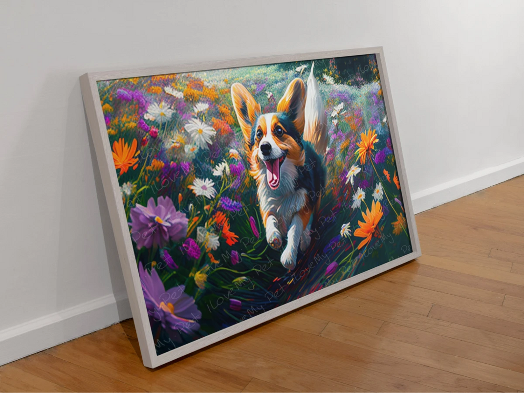 Immerse yourself in the playful charm of our Joyful Floral Corgi Frolic Wall Art Poster.