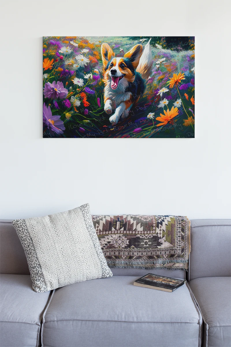 The standout feature of this design is the seamless integration of the Corgi's image with the floral background, evoking a sense of movement and vitality. It's a captivating display of artistry, making it tail-waggingly good Corgi Art for Corgi lovers.