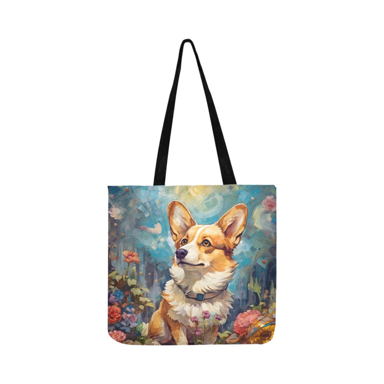 This exquisite tote bag showcases the Welsh Corgi, a breed renowned for its noble spirit and quaint stature, against the backdrop of an ethereal garden in full bloom.