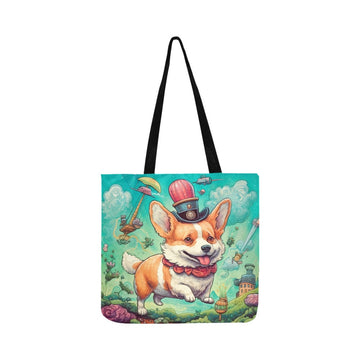 This tote bag features the delightful "Fantastical Flight" artwork, showcasing a jubilant Corgi adorned in a top hat and bow tie, navigating through a dreamy sky of fanciful flying machines and ethereal flora.