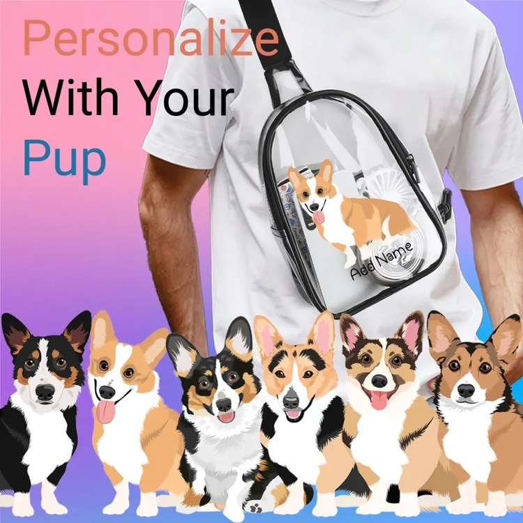 Introducing the Personalized Corgi Love Unisex Transparent Sling Bag, a delightful blend of style and sentiment. This bag is perfect for showcasing your love for Corgis, featuring a charming cartoonish Corgi illustration.
