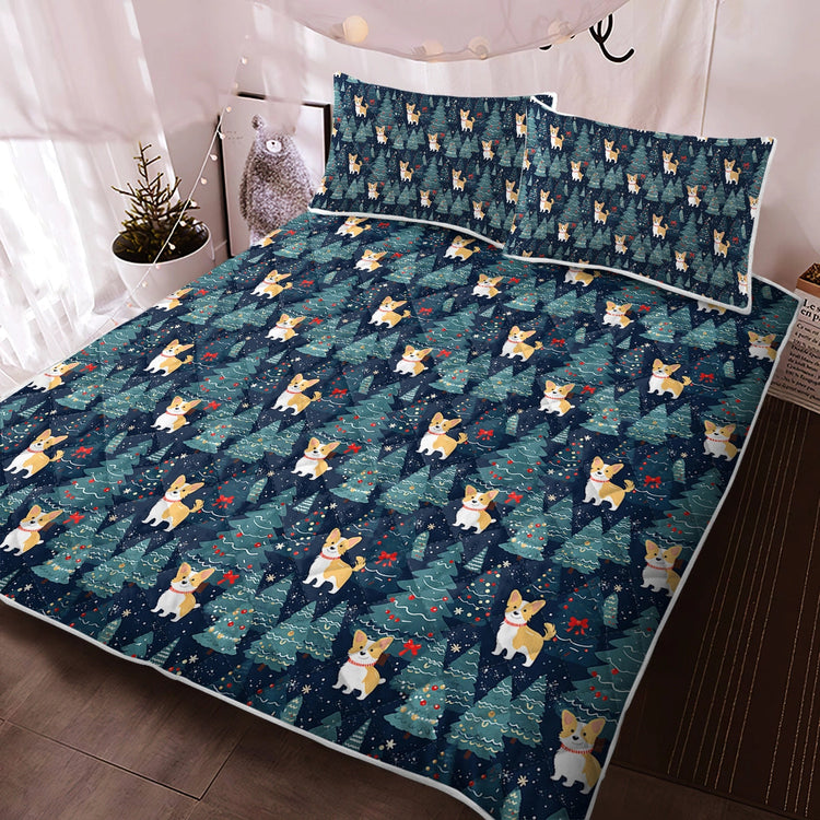This Corgi Christmas Tree Mosaic Quilt Blanket Bedding Set is a heartwarming holiday narrative. Adorable Welsh Corgis, with jubilant smiles and bright white and tan coats, frolic among beautifully decorated Christmas trees.