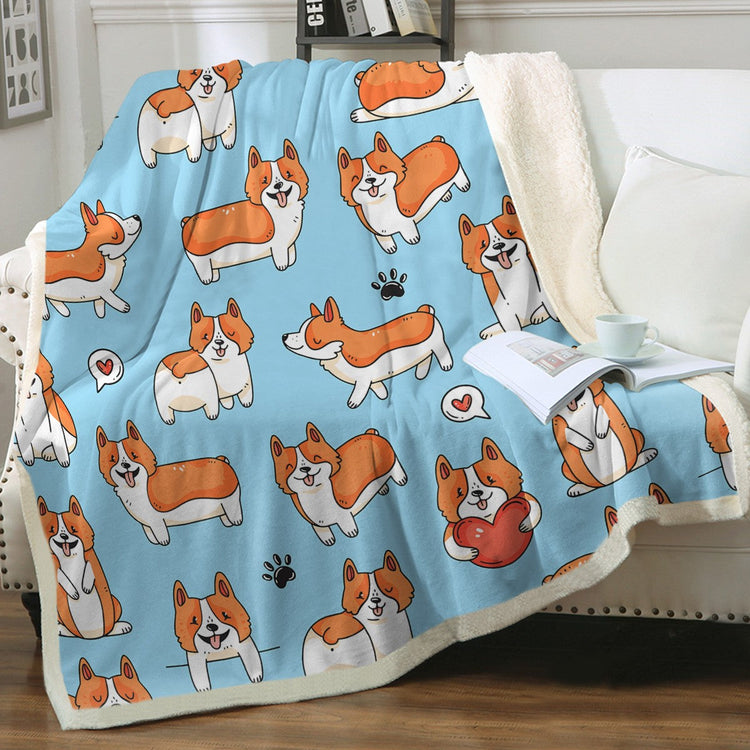 This blanket showcases the cutest smiling Corgis, each expressing their love in their own unique way. One Corgi holds a big red heart, while others have adorable red heart speech bubbles, creating a heartwarming and joyful design.