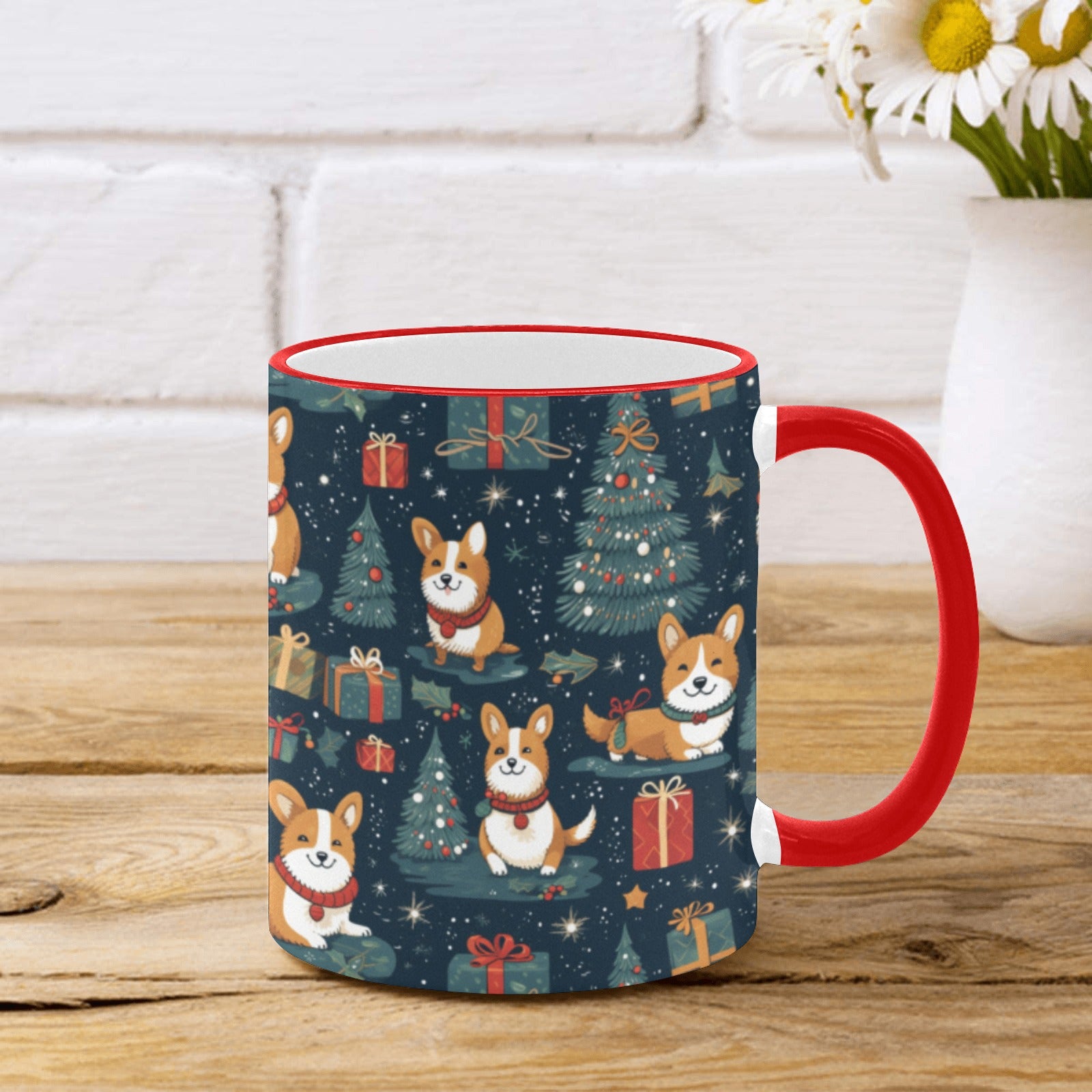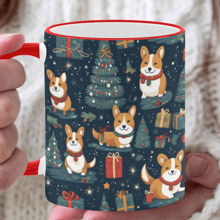 This delightful mug features a heartwarming design of Corgis in joyful poses, adorned with festive collars, surrounded by gifts and beautifully decorated trees.