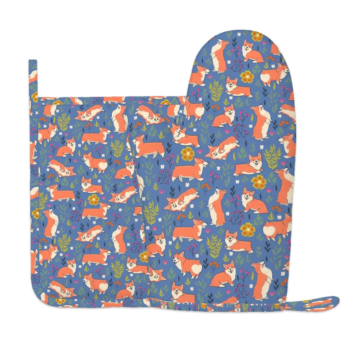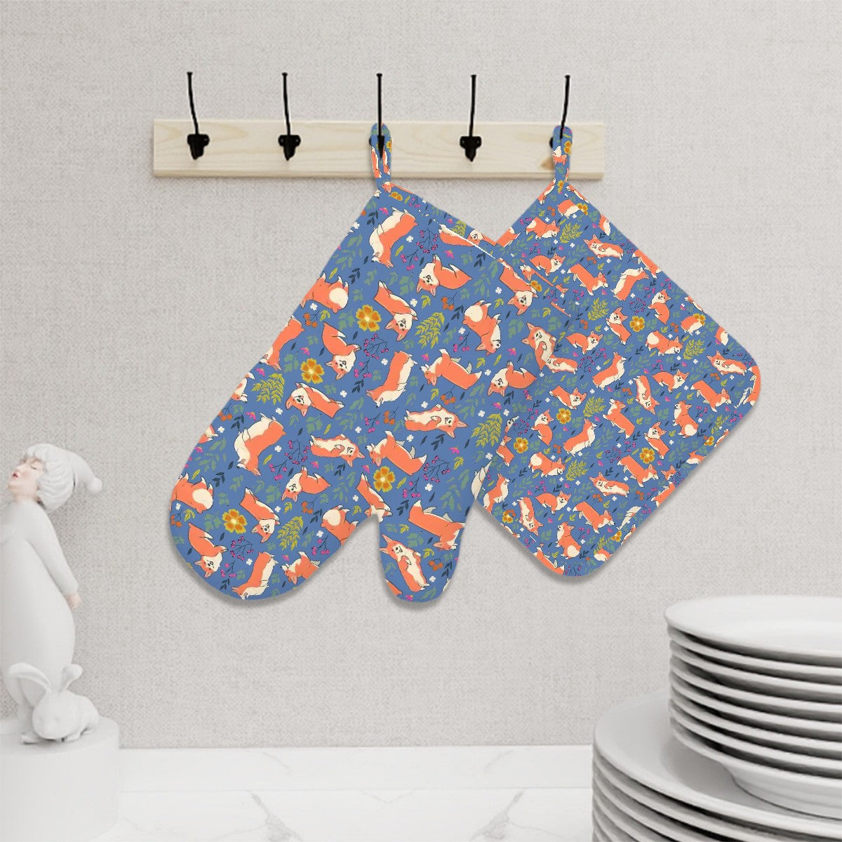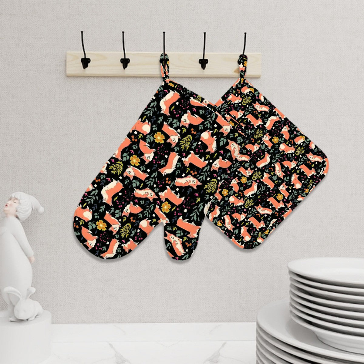 Flower Garden Corgis Oven Mitts and Pot Holder Set