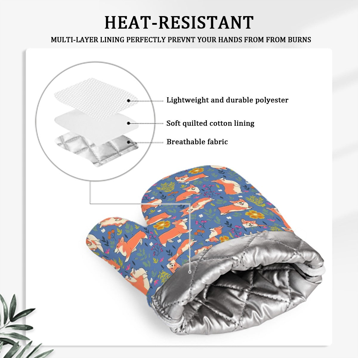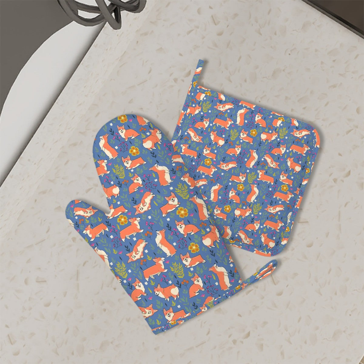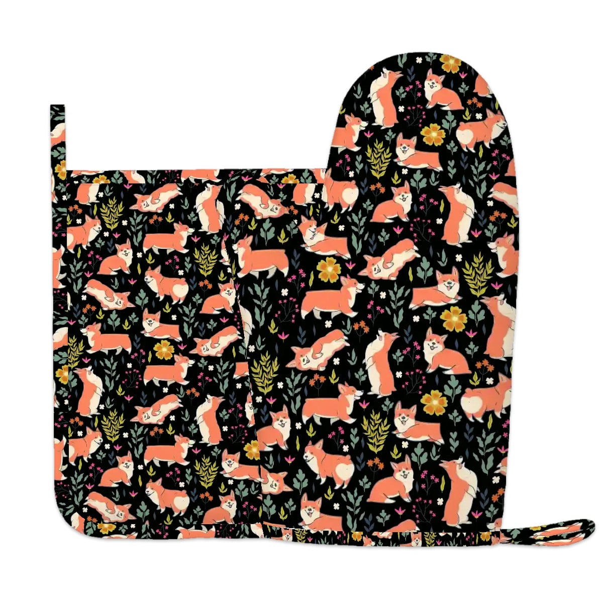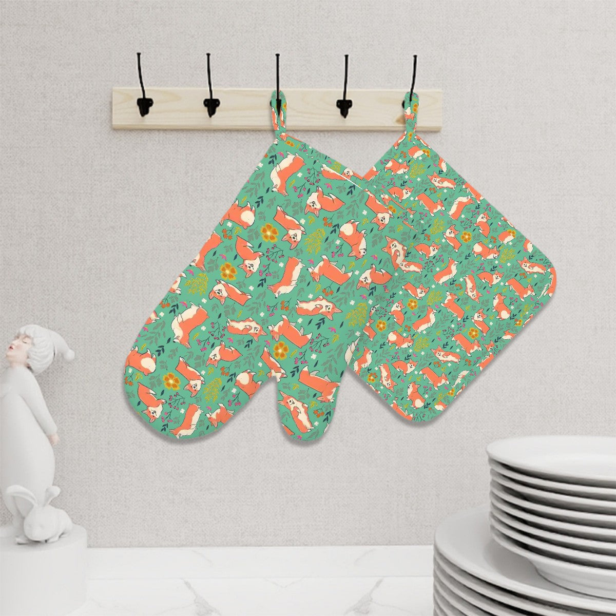 Flower Garden Corgis Oven Mitts and Pot Holder Set