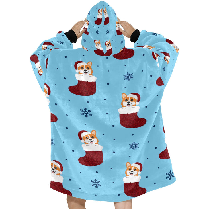 This blanket hoodie features adorable Corgis wearing red Santa hats nestled inside glittery red Christmas stockings. The design is accentuated by snowflakes all around, creating a truly enchanting and festive atmosphere. It's an irresistible combination of cuteness and holiday spirit.