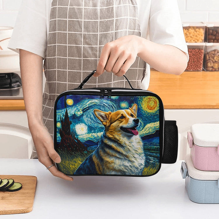 This unique lunch bag features a jubilant Corgi set against the mesmerizing backdrop of Van Gogh's “The Starry Night.”