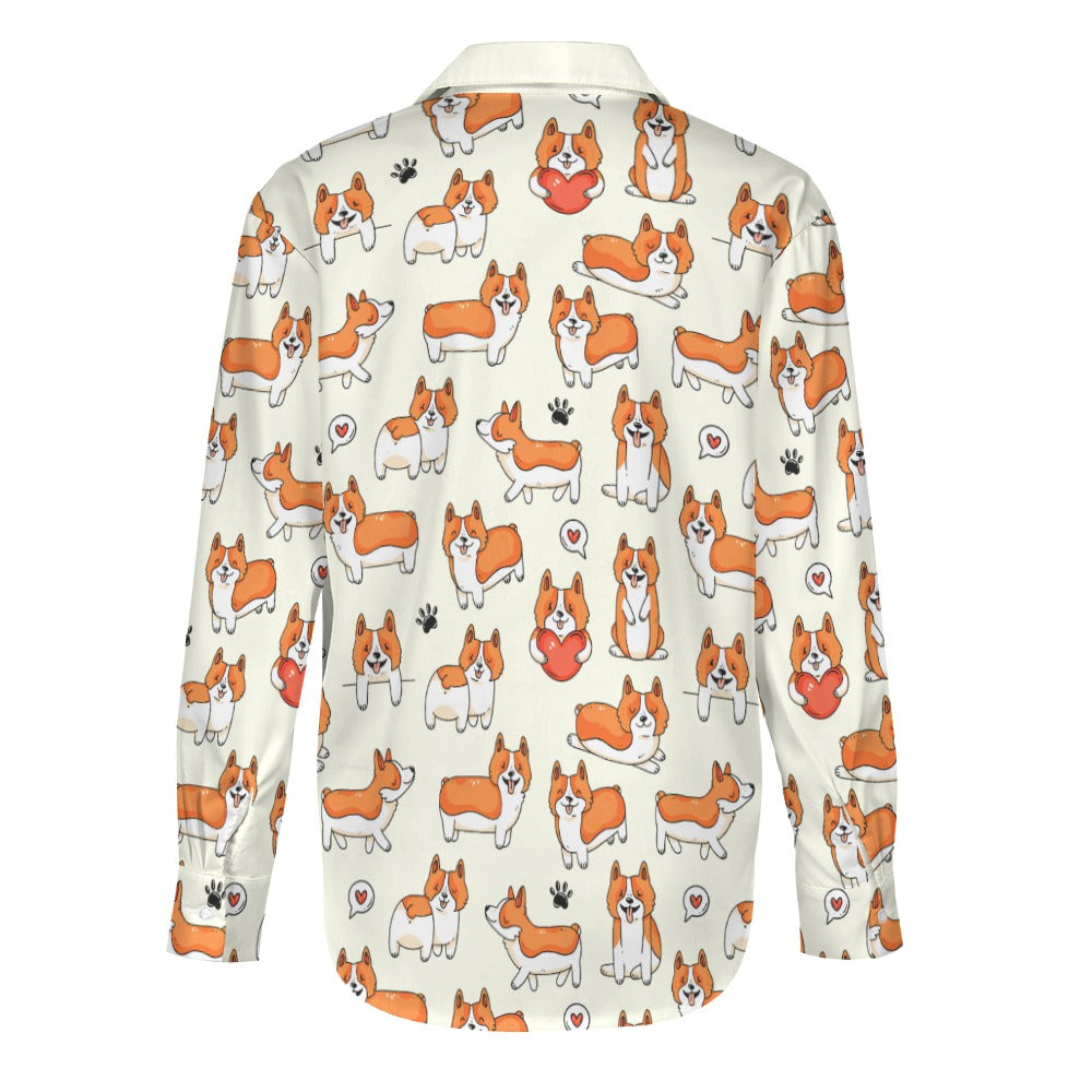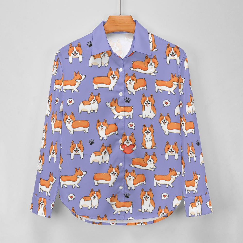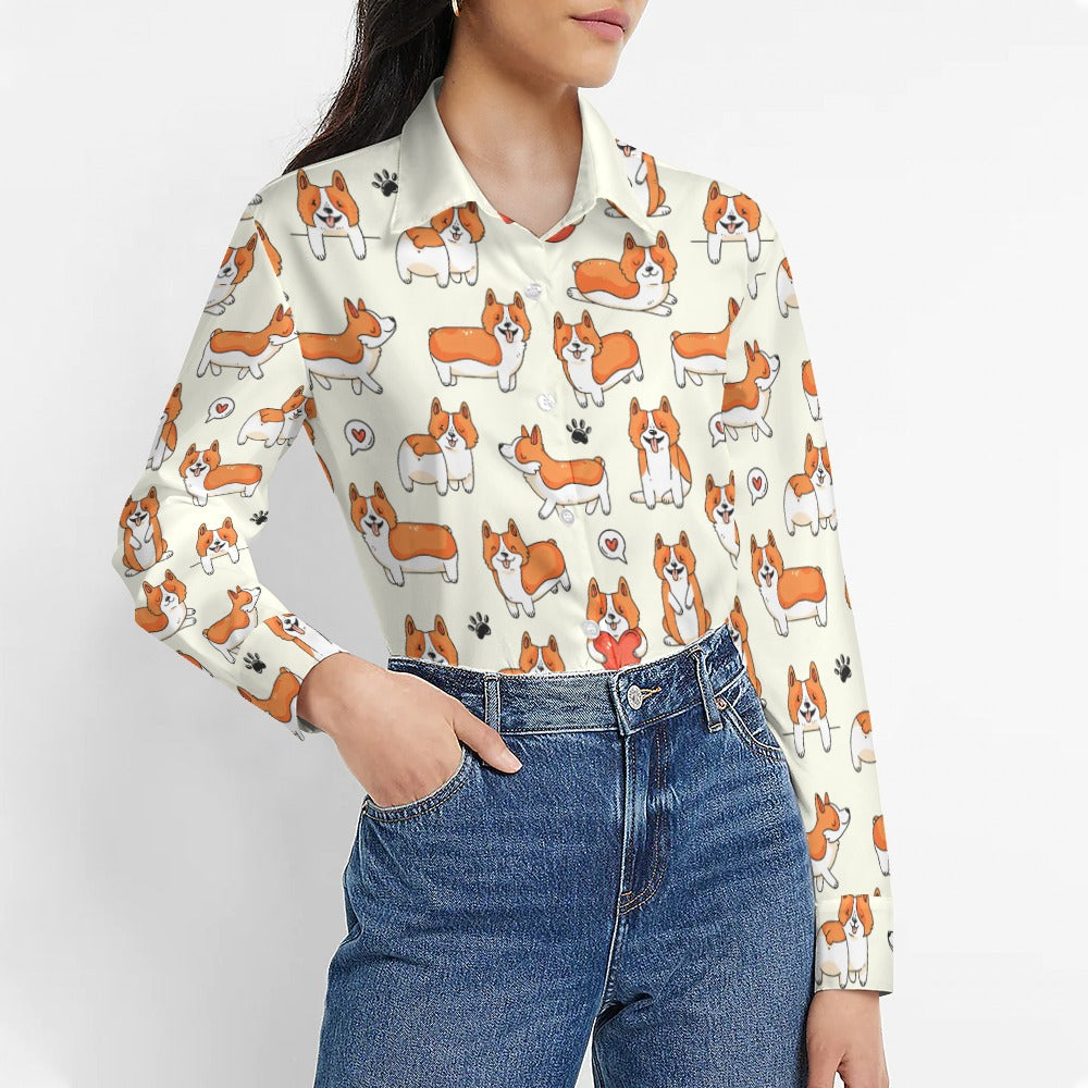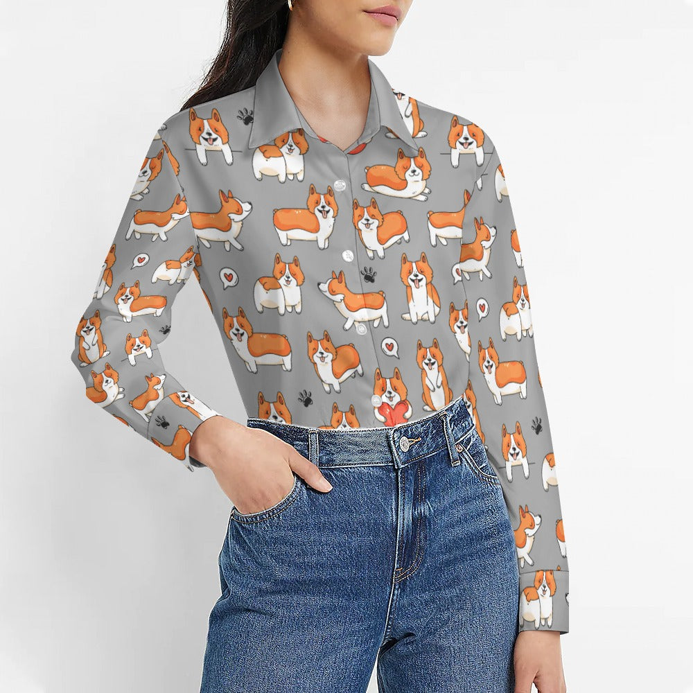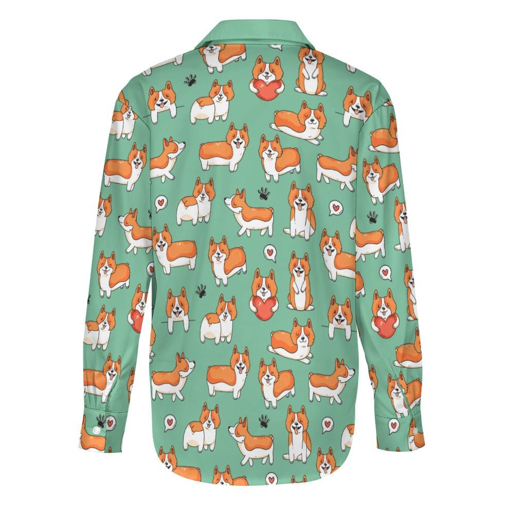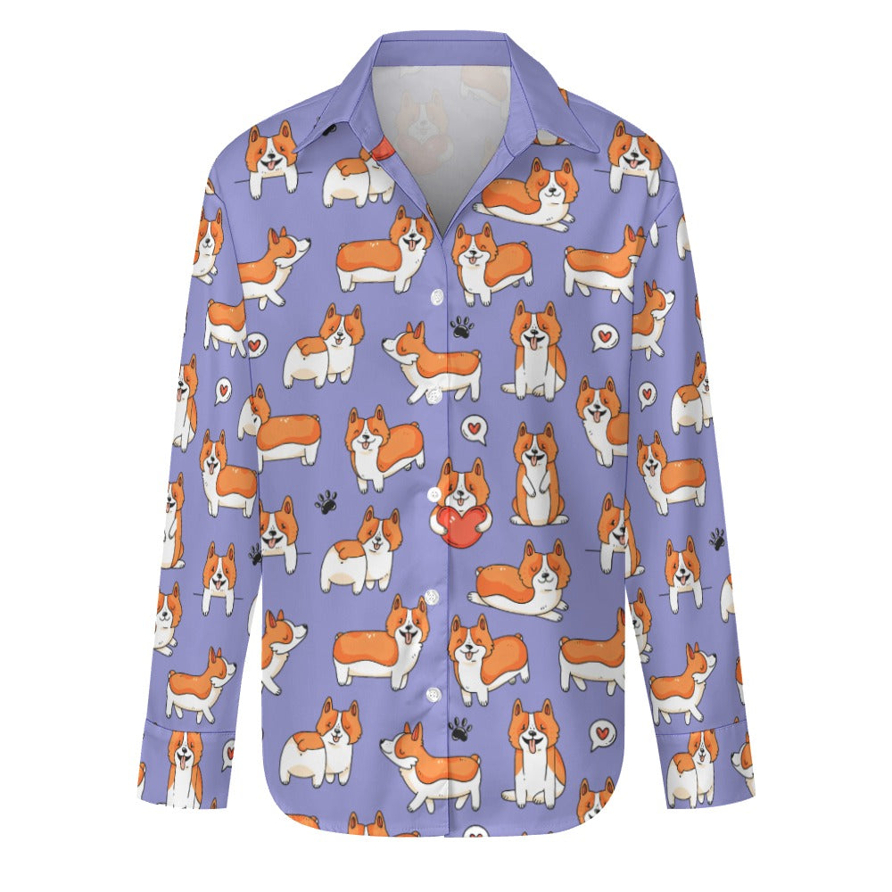 Celebrate your love for Corgis with our Adorable Corgi Love Parade Women's Shirt! This delightful shirt features a playful pattern of cartoon Corgis, each radiating joy and charm.