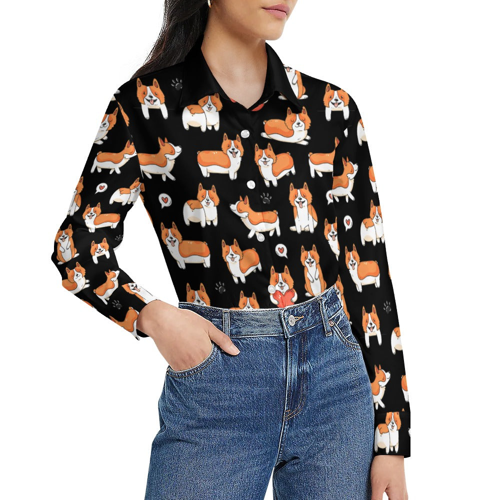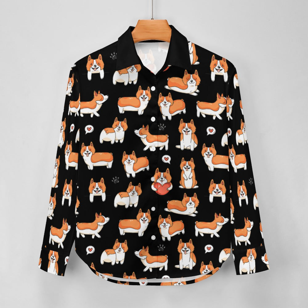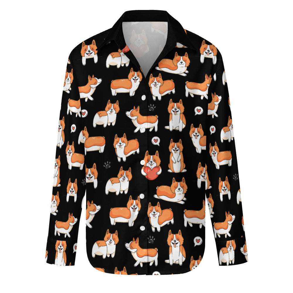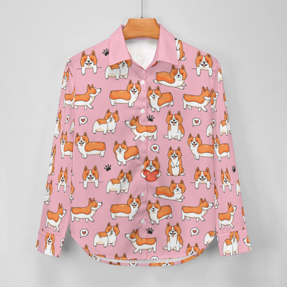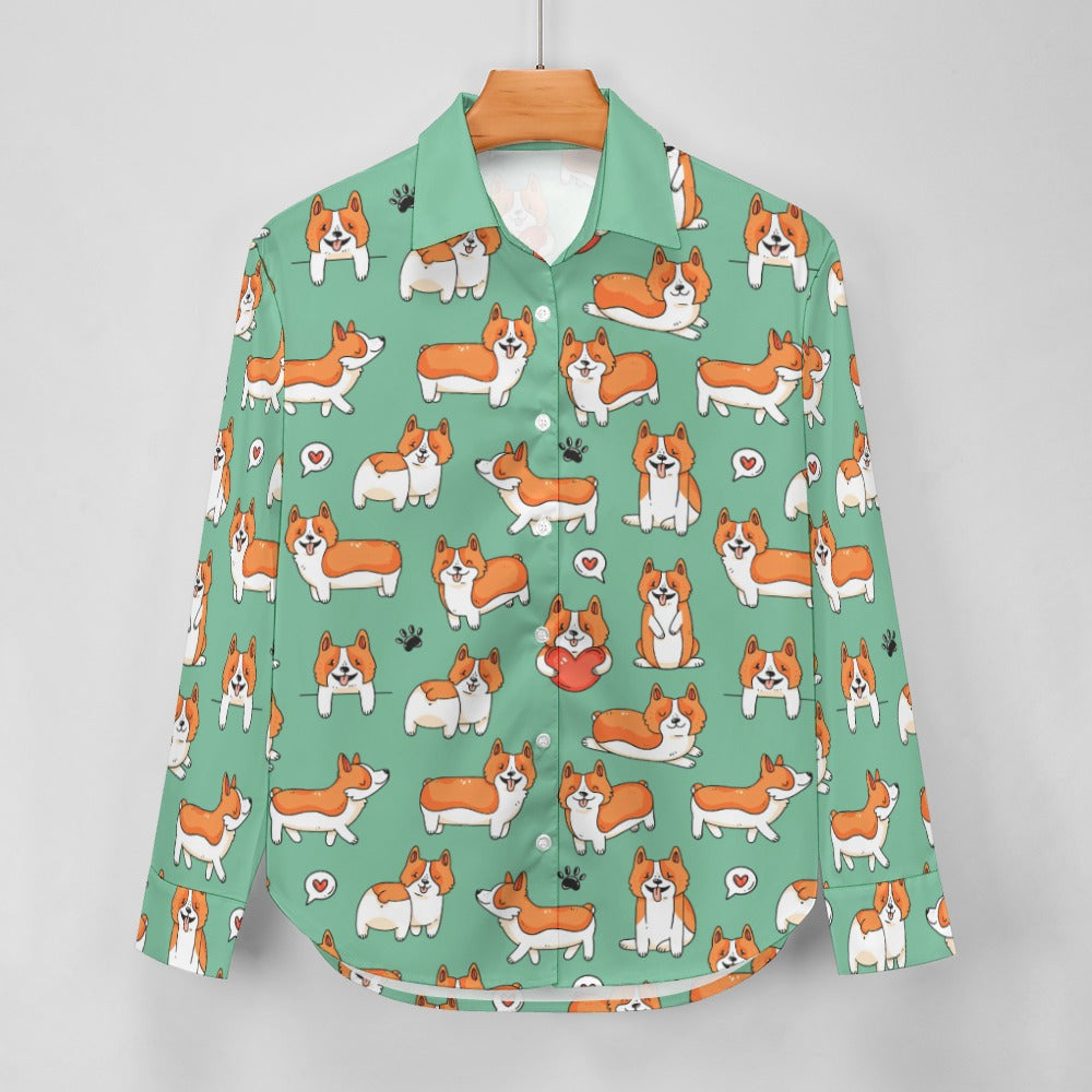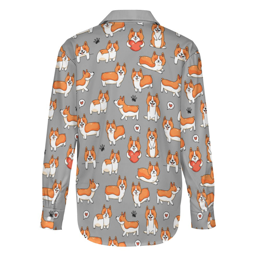 Celebrate your love for Corgis with our Adorable Corgi Love Parade Women's Shirt! This delightful shirt features a playful pattern of cartoon Corgis, each radiating joy and charm.