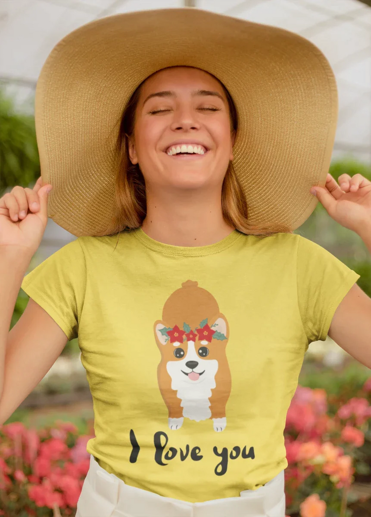 Introducing our Flower Tiara Corgi Girl Love Women's Cotton T-Shirts, featuring an adorable girl Corgi wearing a flower tiara and the text "I love you" boldly displayed below.