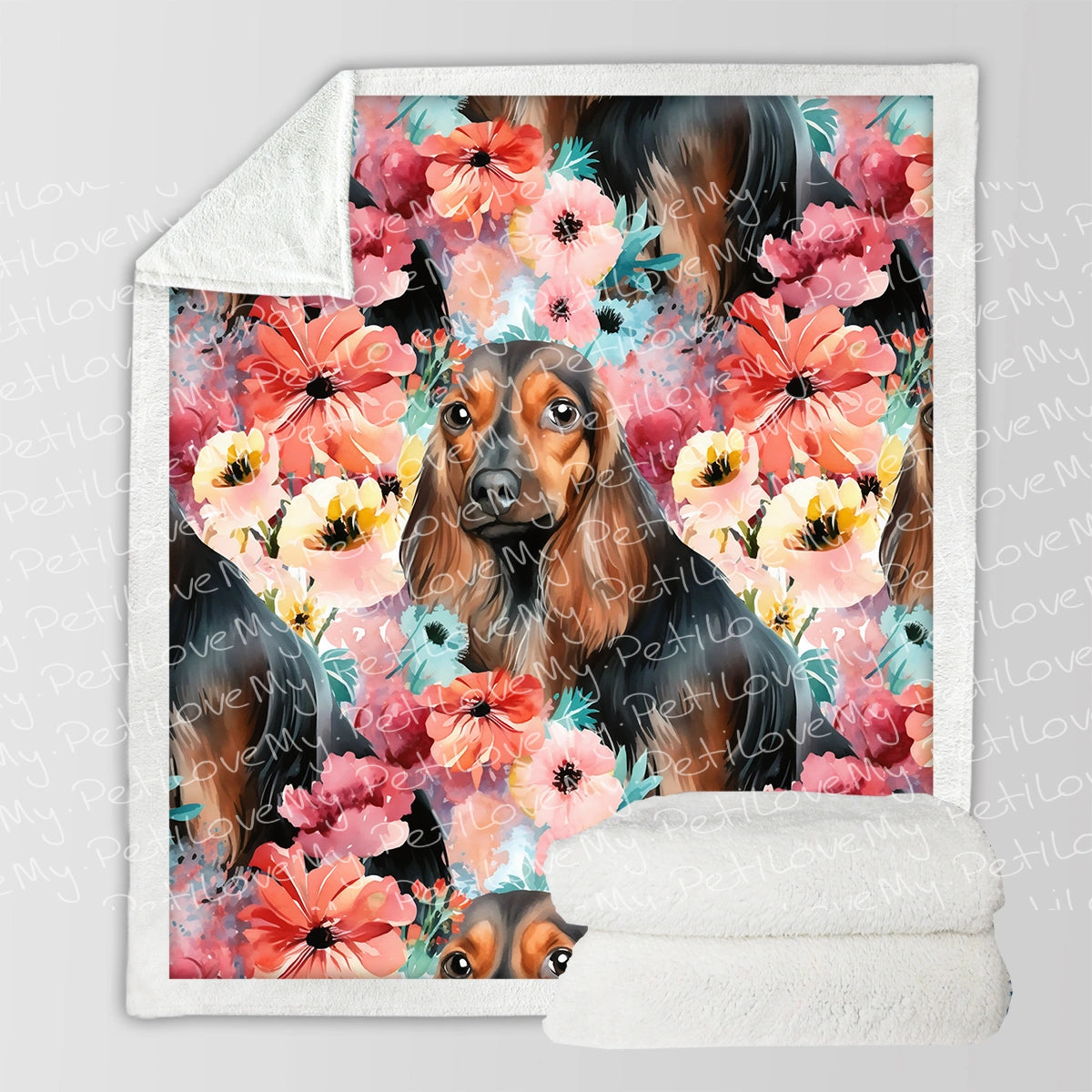 Bring home the whimsical charm of our Vivid Floral Black and Tan Dachshunds Soft Warm Fleece Blanket.