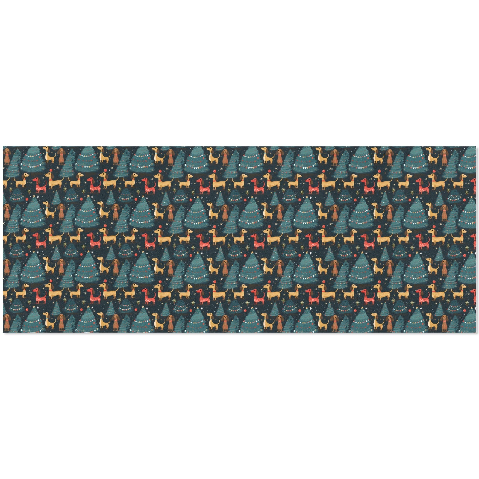 This enchanting design features whimsically attired Dachshunds against a backdrop of Christmas trees under a star-filled night sky.