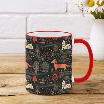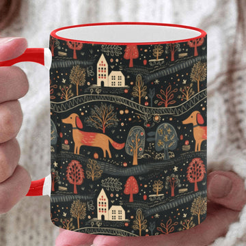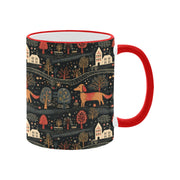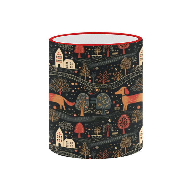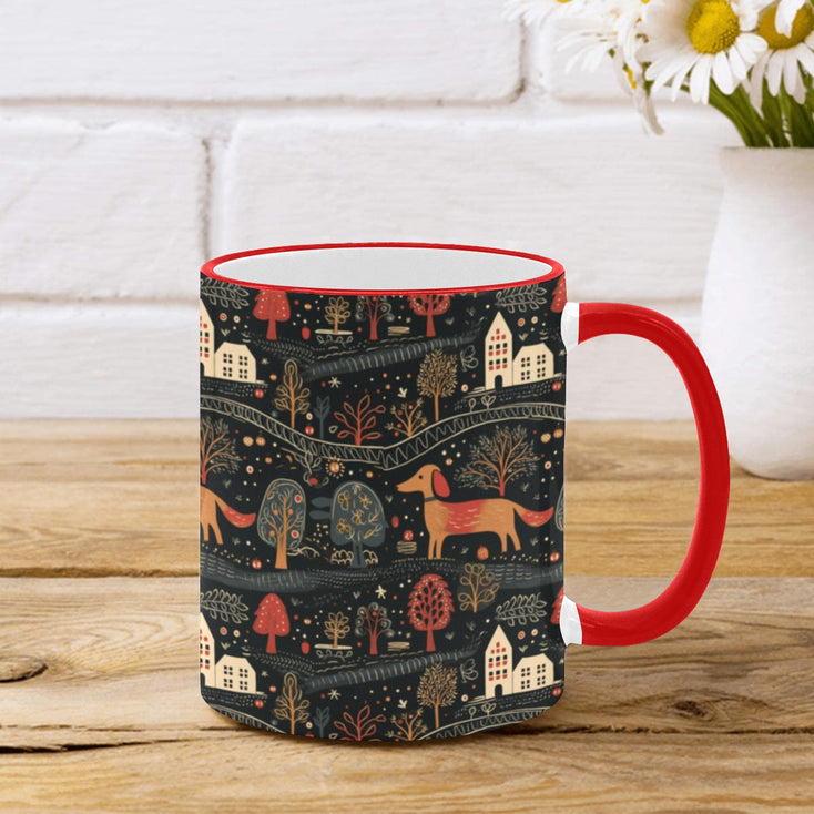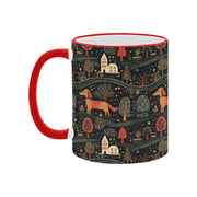 This delightful mug features playful Dachshunds, charming homes, and nature-inspired motifs, all set against a rustic color palette that evokes warmth and nostalgia.