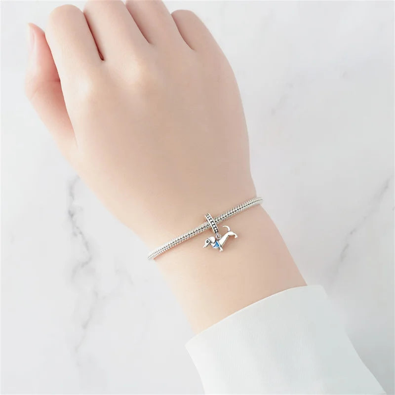 This Adorable Blue Collar Dachshund Pendant Charm is crafted in 925 sterling silver and sparkles with zircon. Made with love and care, just like the way you treat your furry family member.