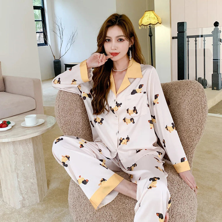 Wrap yourself in comfort and style with the Black and Tan Dachshund Love Women's Imitation Silk Pajamas Set. Made from a luxurious blend of cotton and polyester, these pajamas are perfect for cooler climates.
