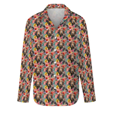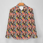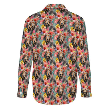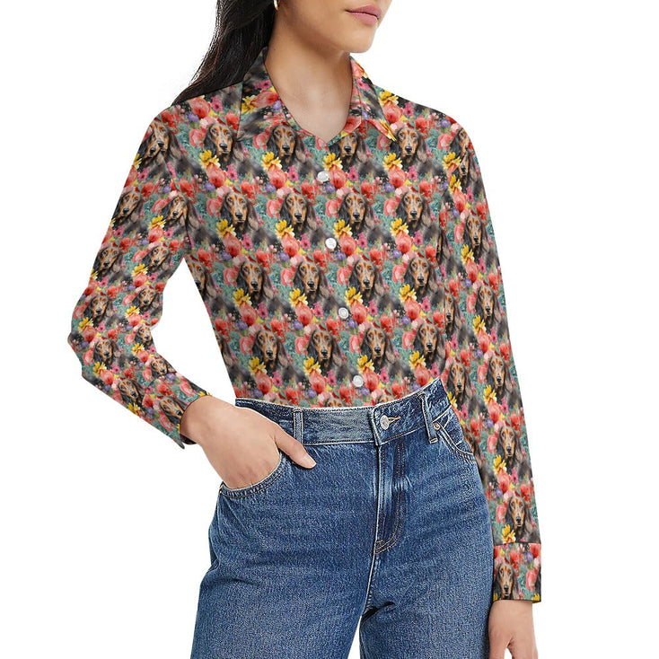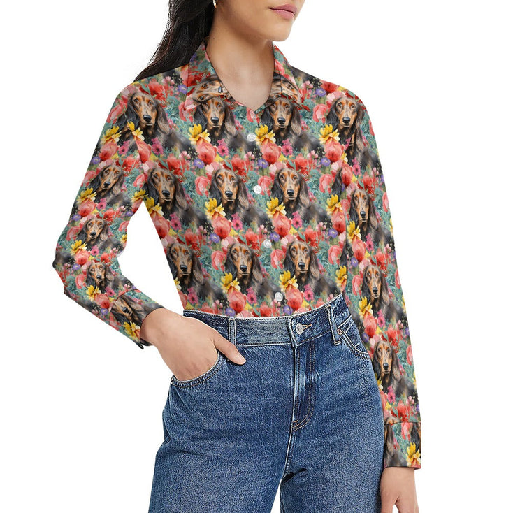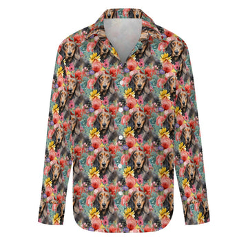 This striking women's shirt features an enchanting piece of artwork that beautifully marries the joyfulness of a lively Dachshund with the elegance of intricately designed flowers. With its harmonious color palette and captivating subject matter, this shirt is more than a fashion statement; it's a celebration of the love and connection between humans and their four-legged friends.