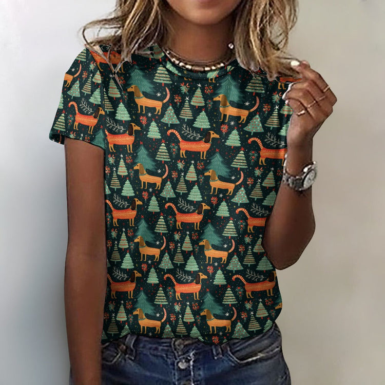 Celebrate the joy of the season with our Festive Dachshund Wonderland Women's Cotton T-Shirt, a perfect gift for Dachshund lovers.
