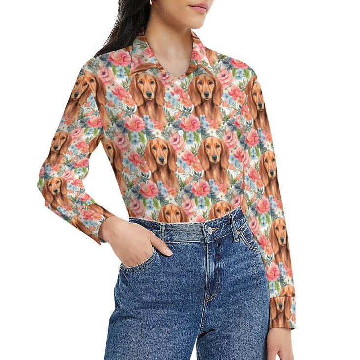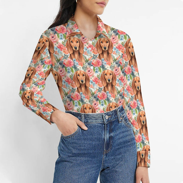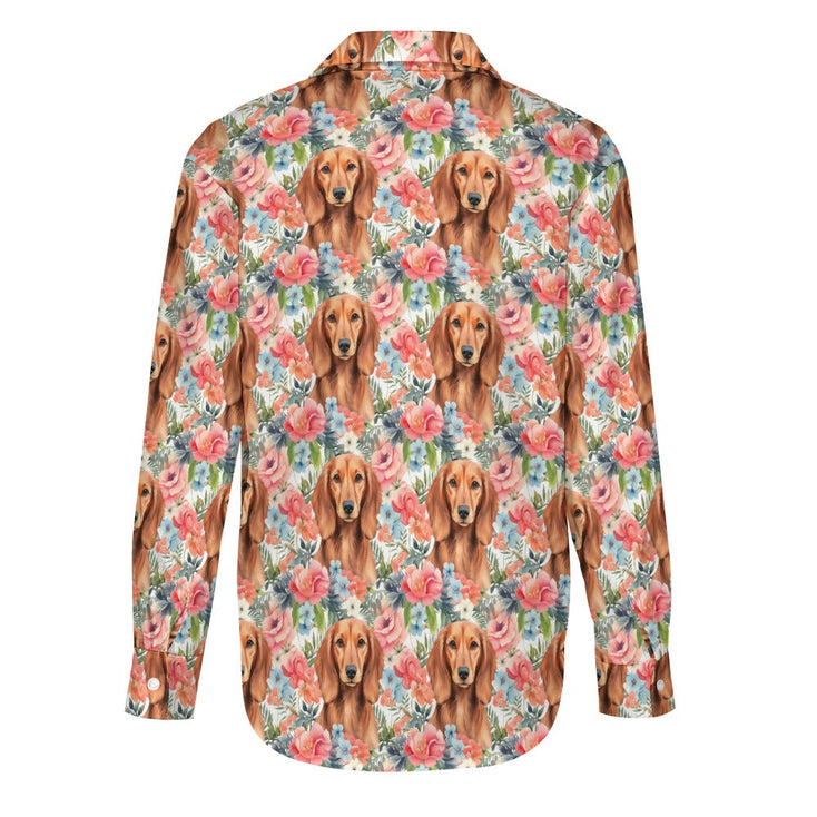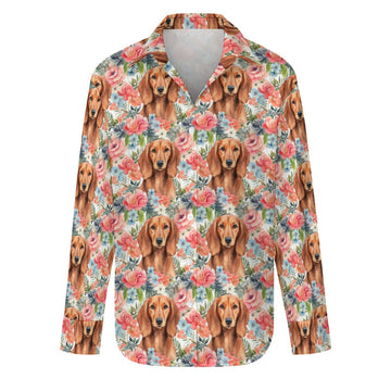 Step into a world of artistry and canine charm with our Floral Meadow Red Dachshunds Women's Shirt.