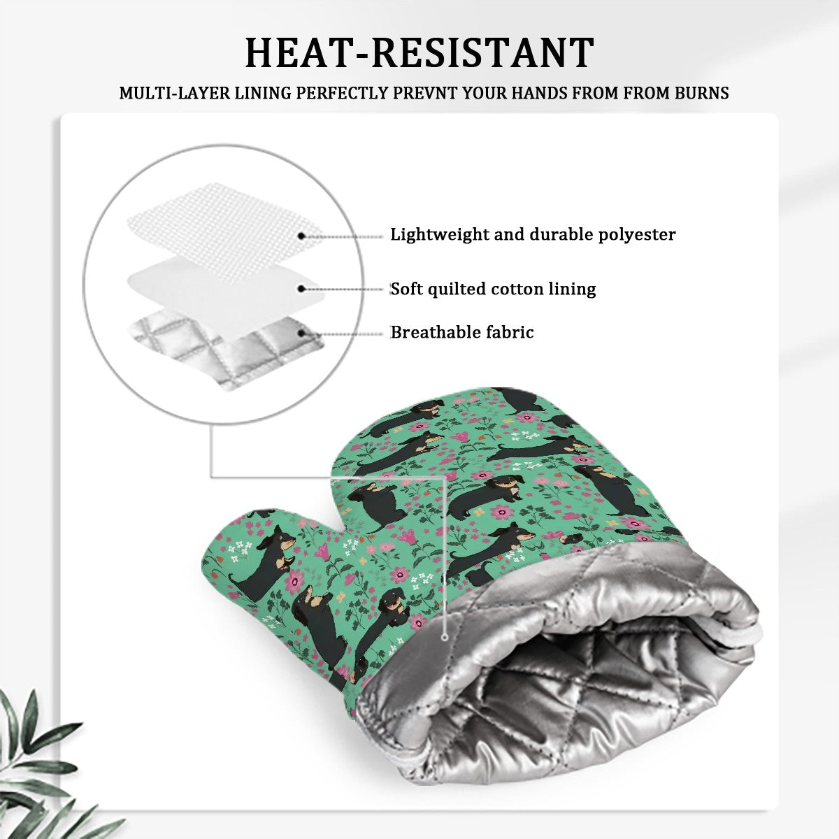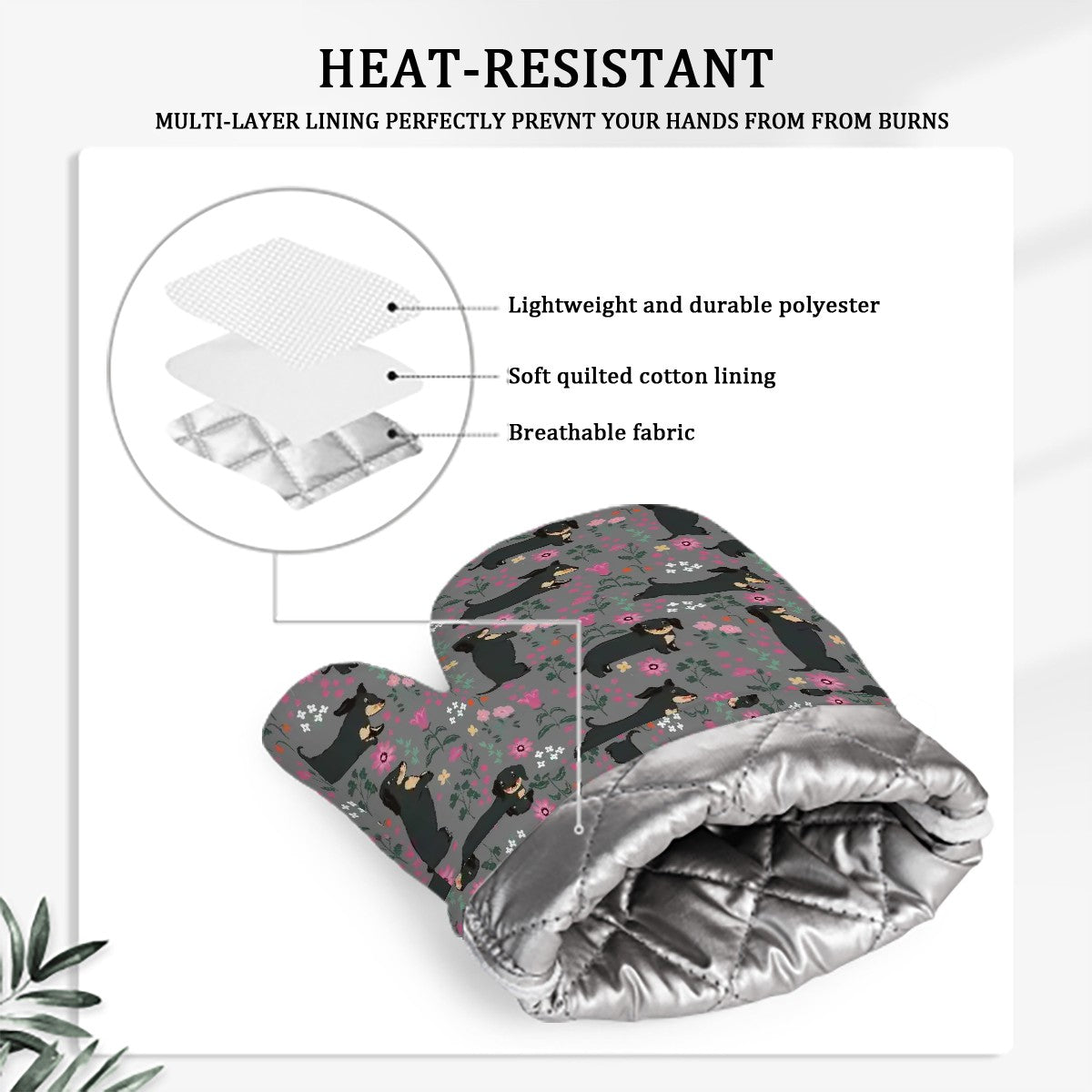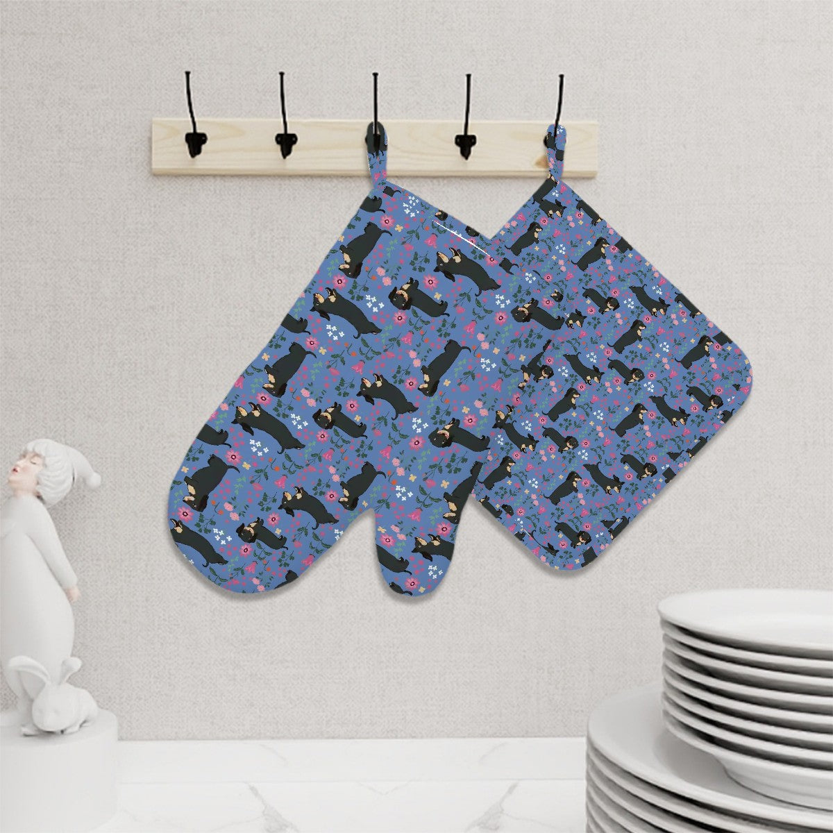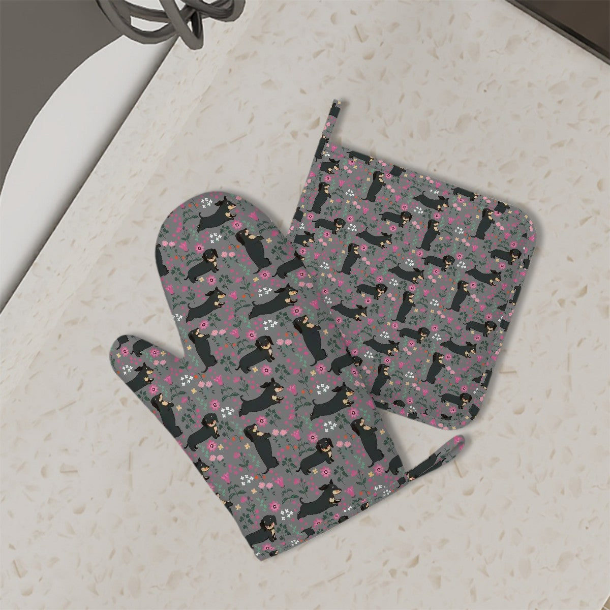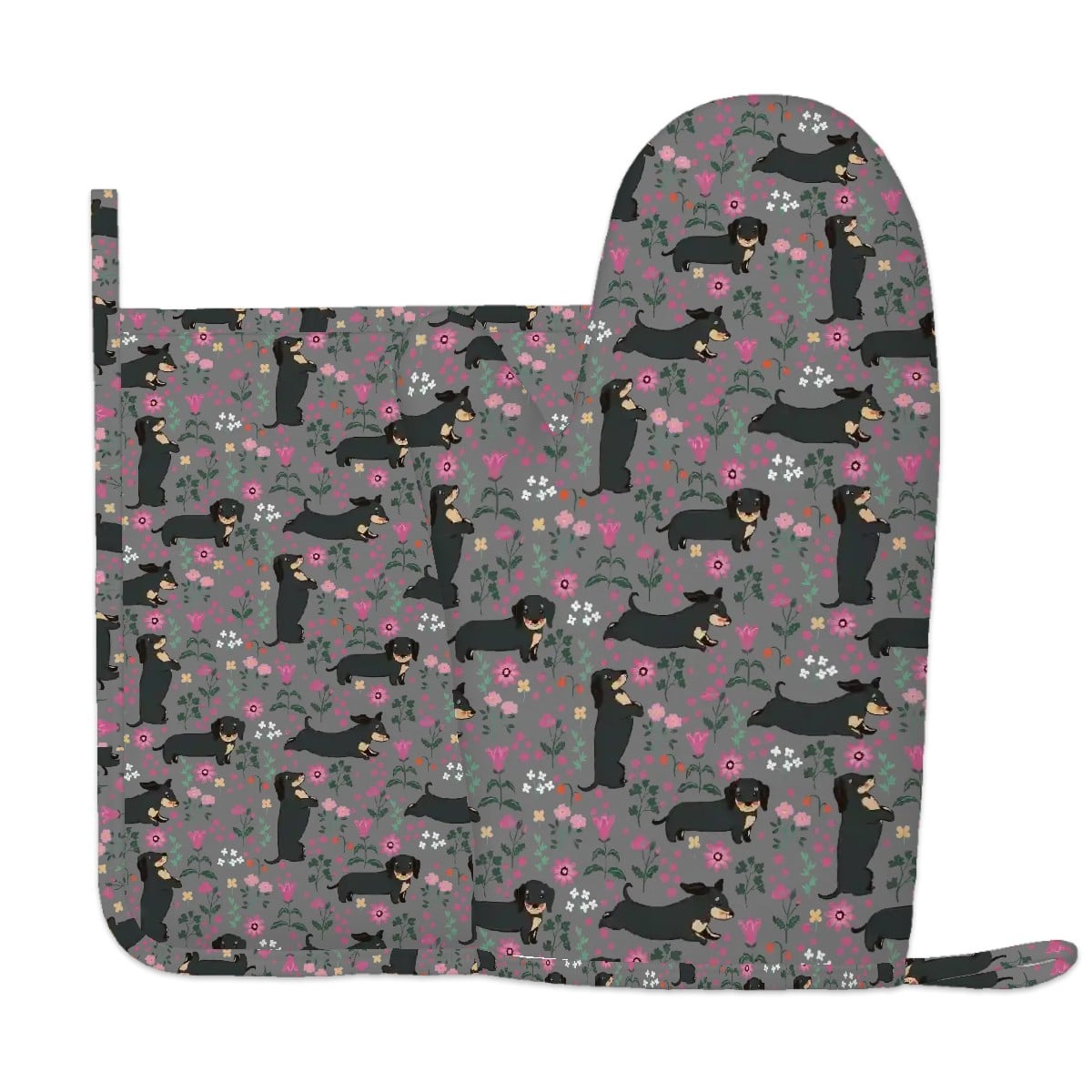 Flower Garden Black Dachshund Oven Mitts and Pot Holder Set