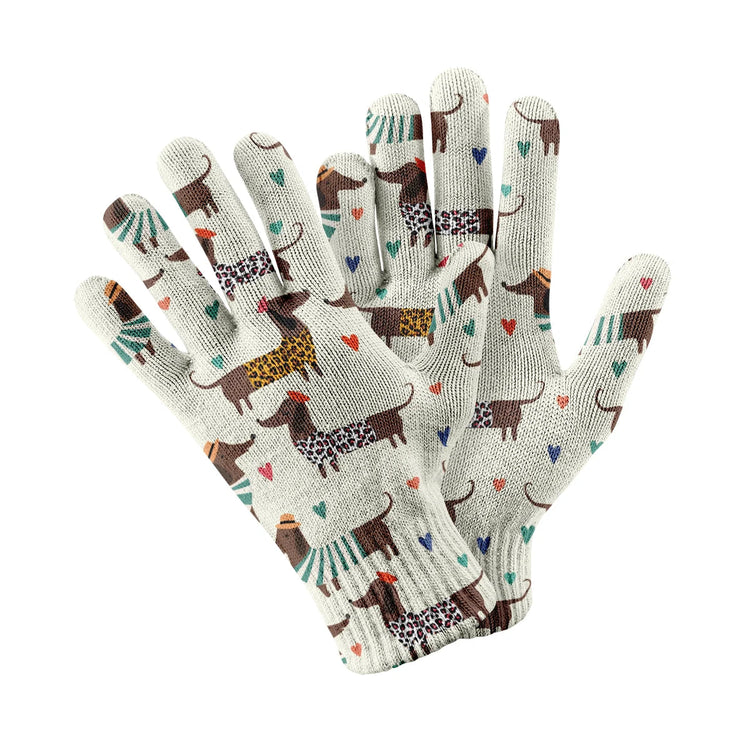 Featuring the cutest French Dachshund design, these gloves are perfect for spreading joy and happiness everywhere. The playful illustration showcases two dachshunds with berets and scarves, forming a heart shape.