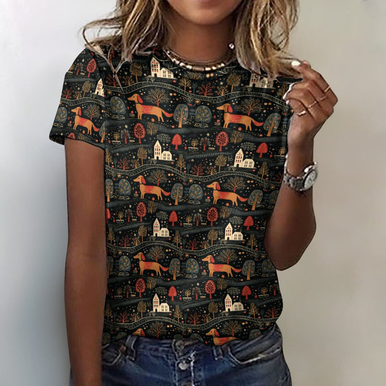 Embrace the charm of the countryside with our Red Dachshund Countryside Holiday Women's Cotton T-Shirt.