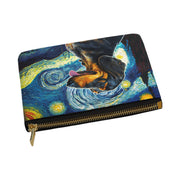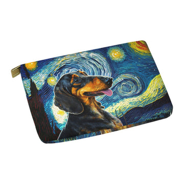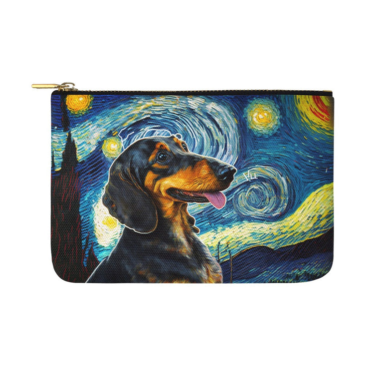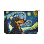 Featuring a delightful Dachshund set against Vincent van Gogh's mesmerizing ""The Starry Night,"" this carry-all pouch marries classic art with the charming quirks of our beloved canine friends.