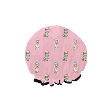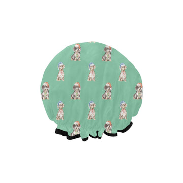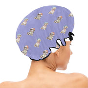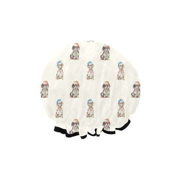 Featuring a beautiful watercolor Christmas pattern of Piebald Dachshunds, these shower caps are adorned with holiday accessories like red and blue Santa hats and Christmas stockings.