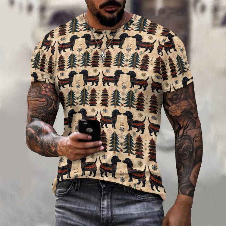 Celebrate the holiday season with our Yuletide Kisses Black Tan Dachshunds Christmas Men's Cotton T-Shirt, a heartwarming tribute to your furry friends.