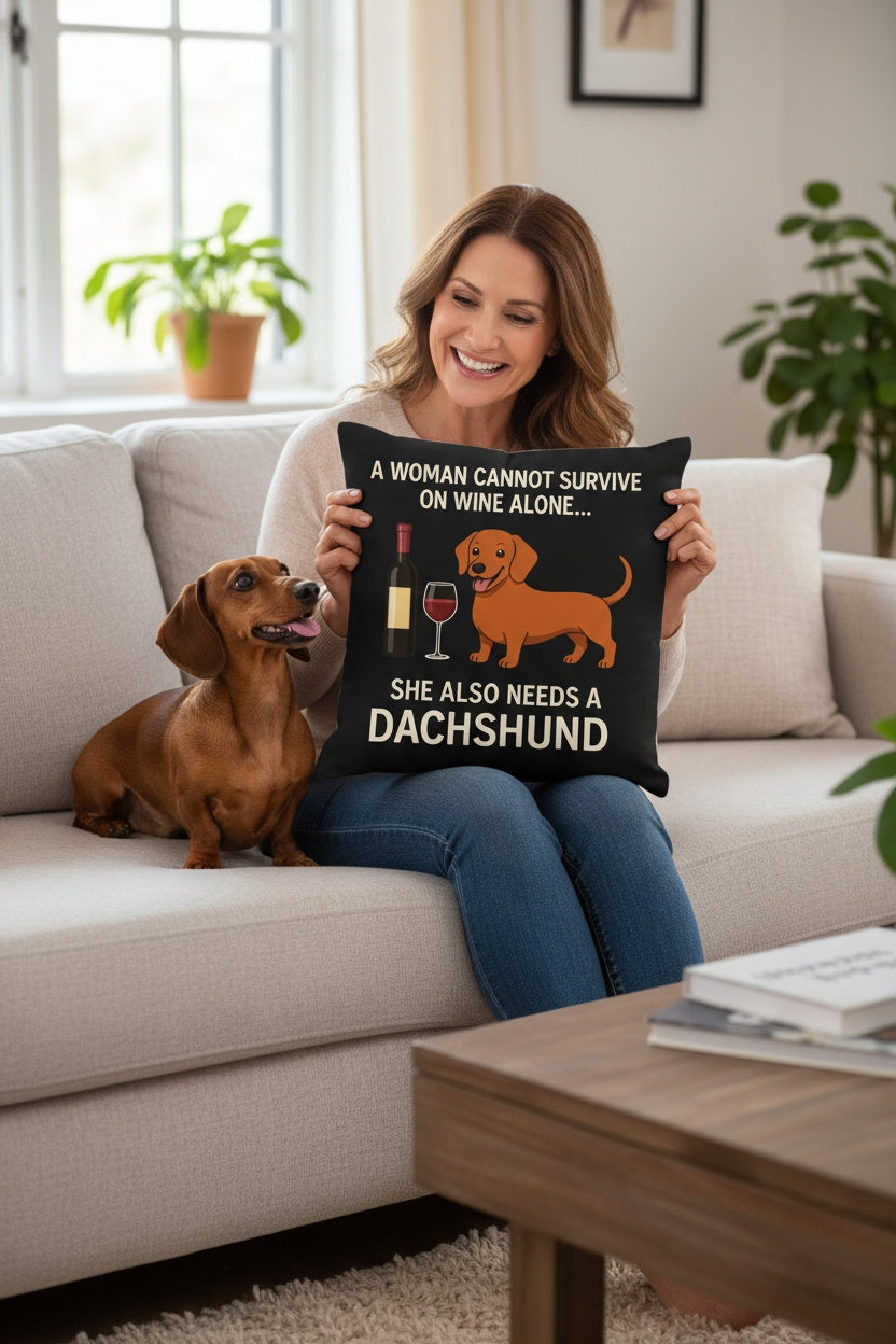 Personalized “A Woman Cannot Survive on Wine Alone…” Dachshund Sausage Dog Pillowcase