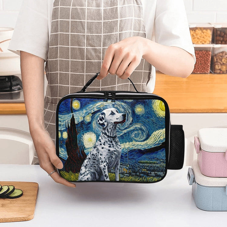 This unique lunch bag brings to life the spirited essence of the Dalmatian breed, set against the mesmerizing backdrop inspired by Vincent van Gogh's "The Starry Night."
