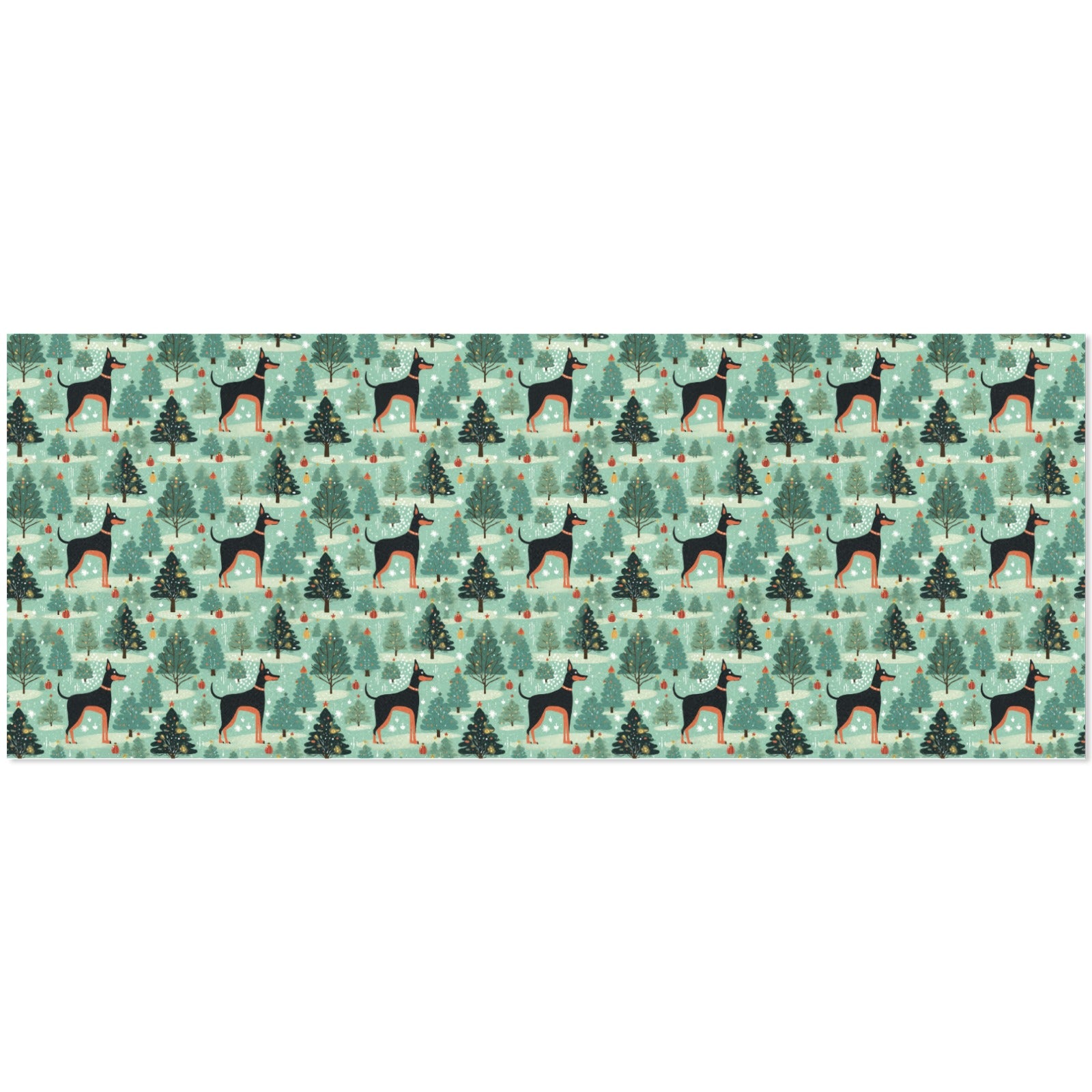 Each roll showcases the noble demeanor of the Doberman, surrounded by whimsically stylized evergreens and delicate snowfall. The harmonious blend of wintry greens, along with the warm hues of the Doberman's sleek coat, creates a festive atmosphere that resonates with the spirit of the season.