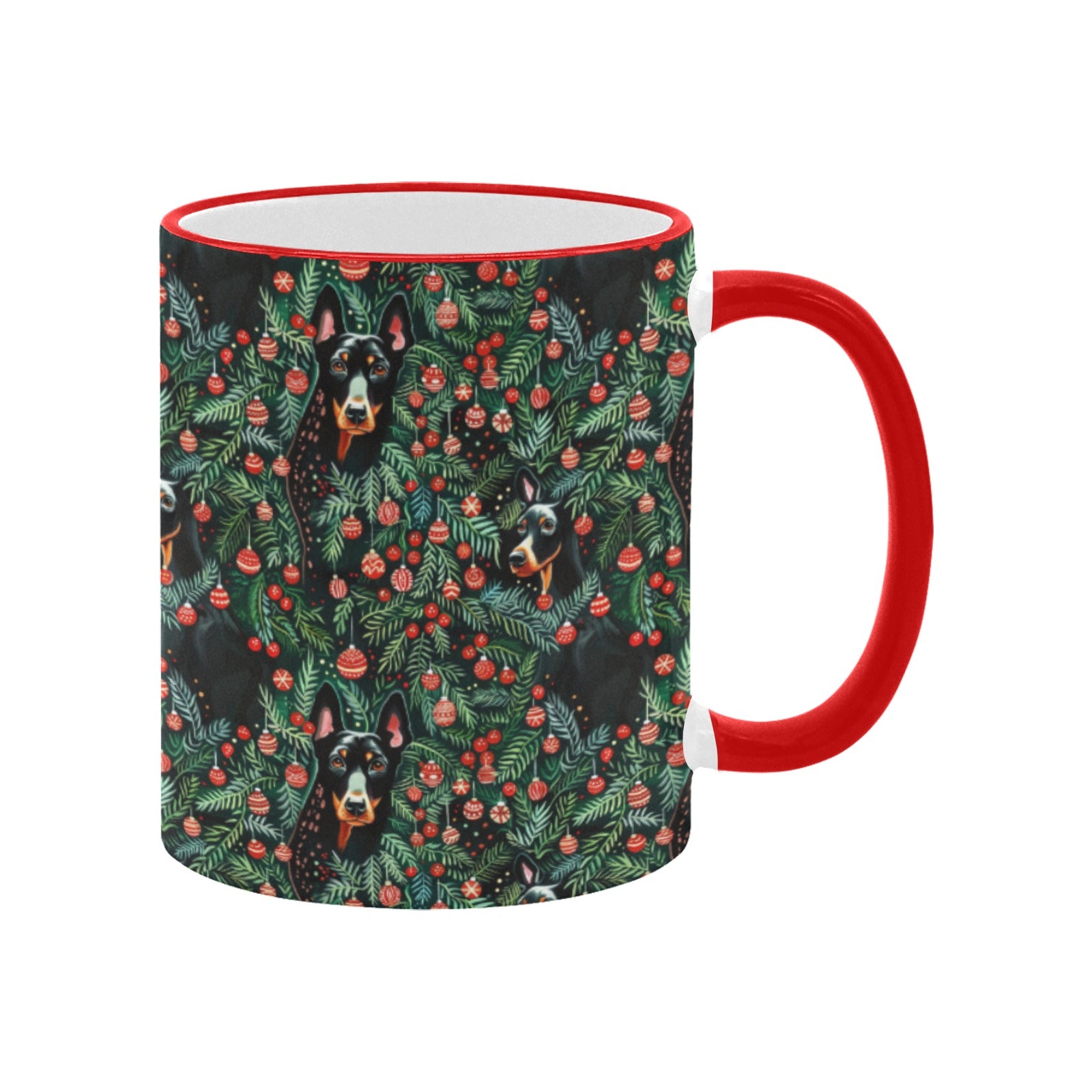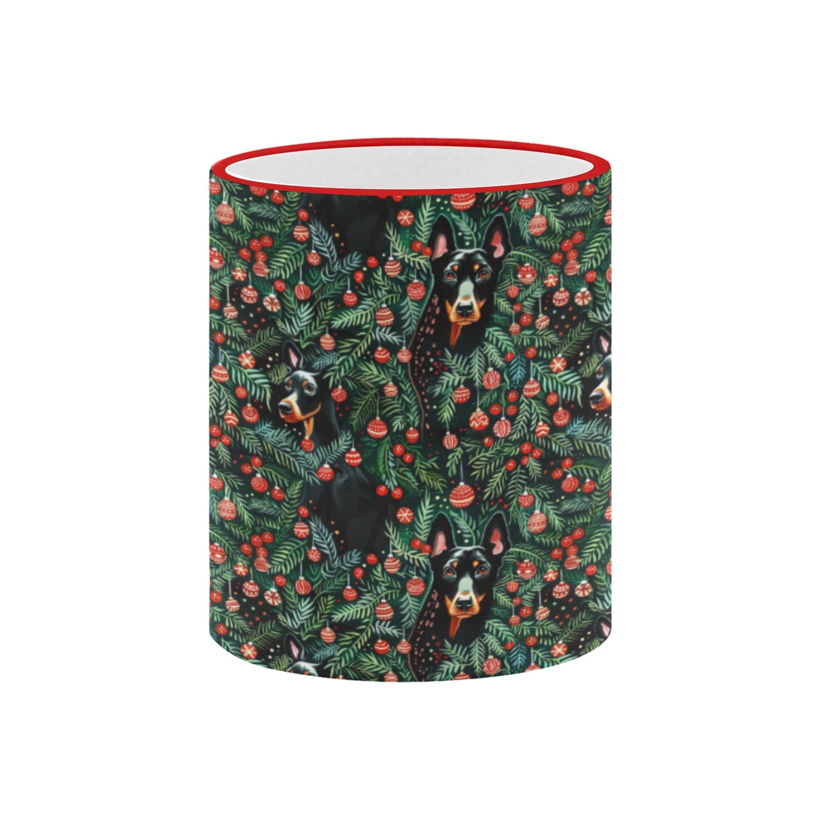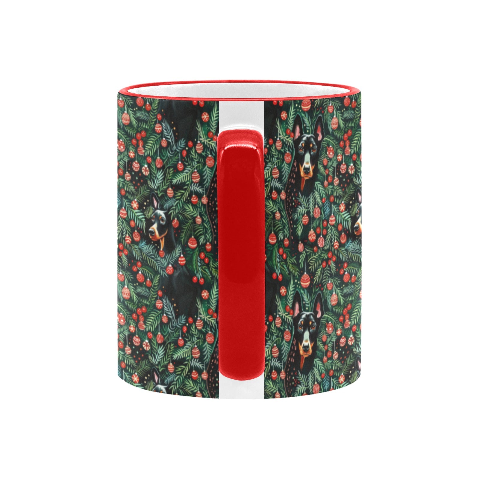 This enchanting mug features Doberman Pinschers amidst a festive backdrop, capturing the warmth and joy of Christmas Eve.