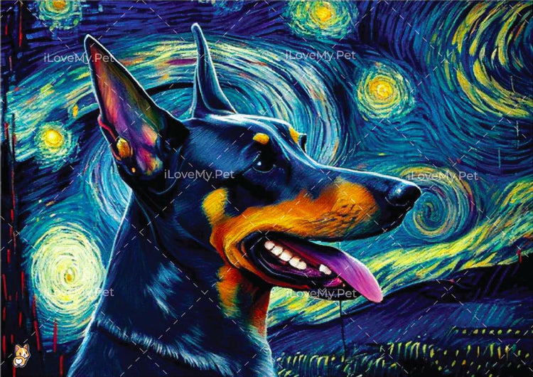 A must-have for any Doberman lover or anyone who loves the outdoors. This Doberman art poster features a beautiful image of a smiling Doberman Pinscher against a backdrop of the milky way galaxy.
