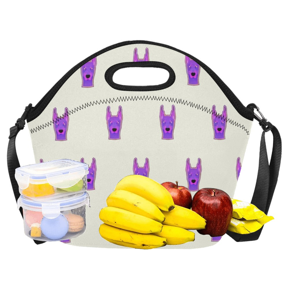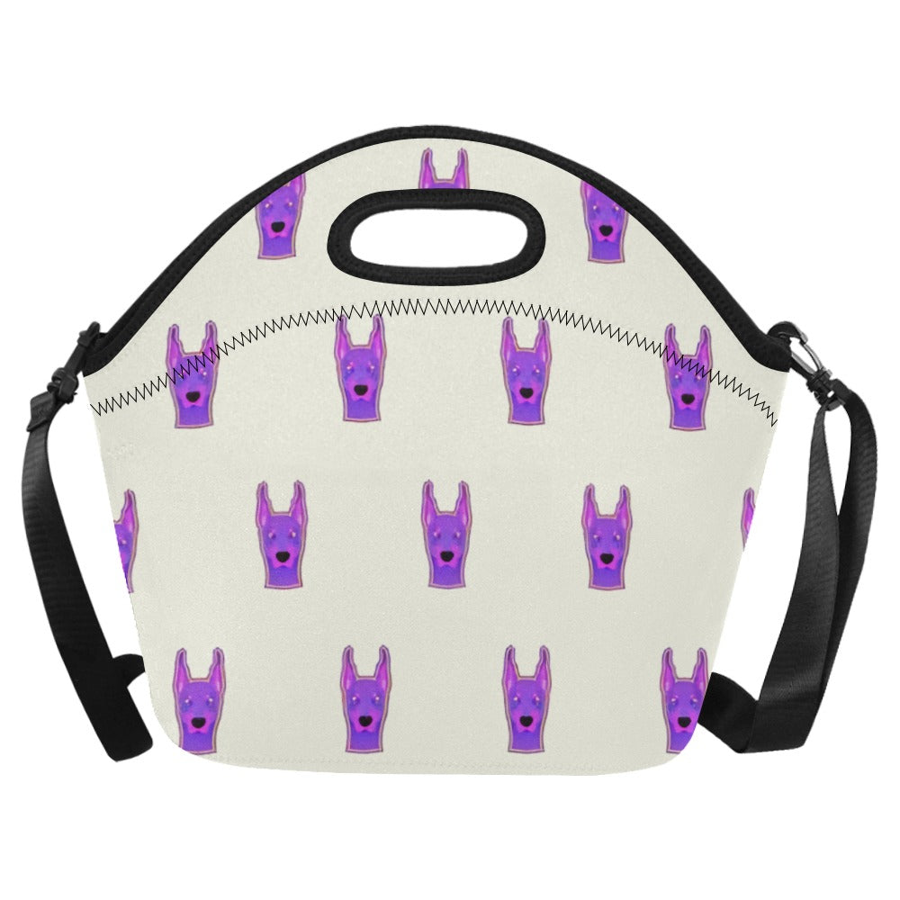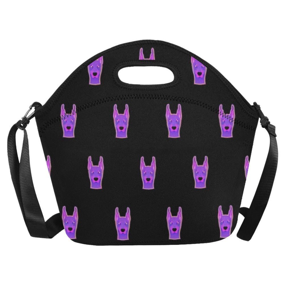 Elevate your lunchtime experience with the Majestic Doberman Neon Portrait Neoprene Lunch Bag, a perfect blend of style and functionality. This eye-catching bag features a vibrant design of stylized Doberman heads in shades of purple and pink, exuding elegance and power.