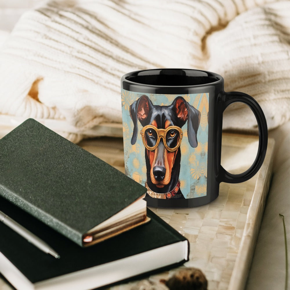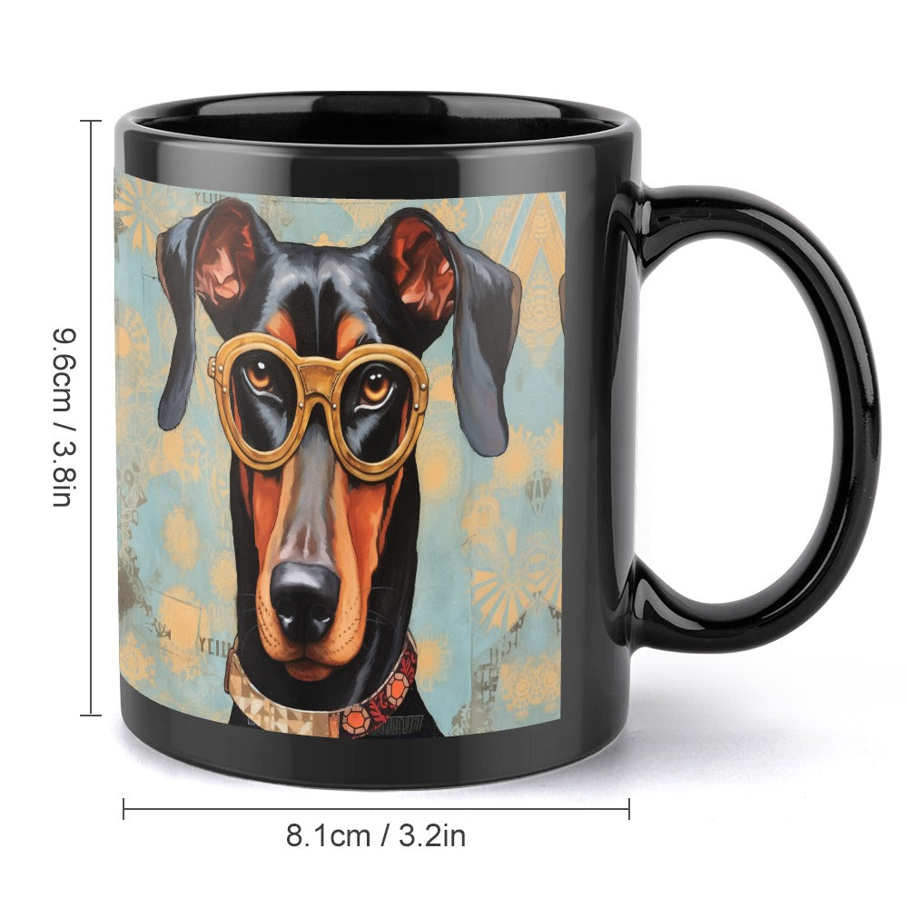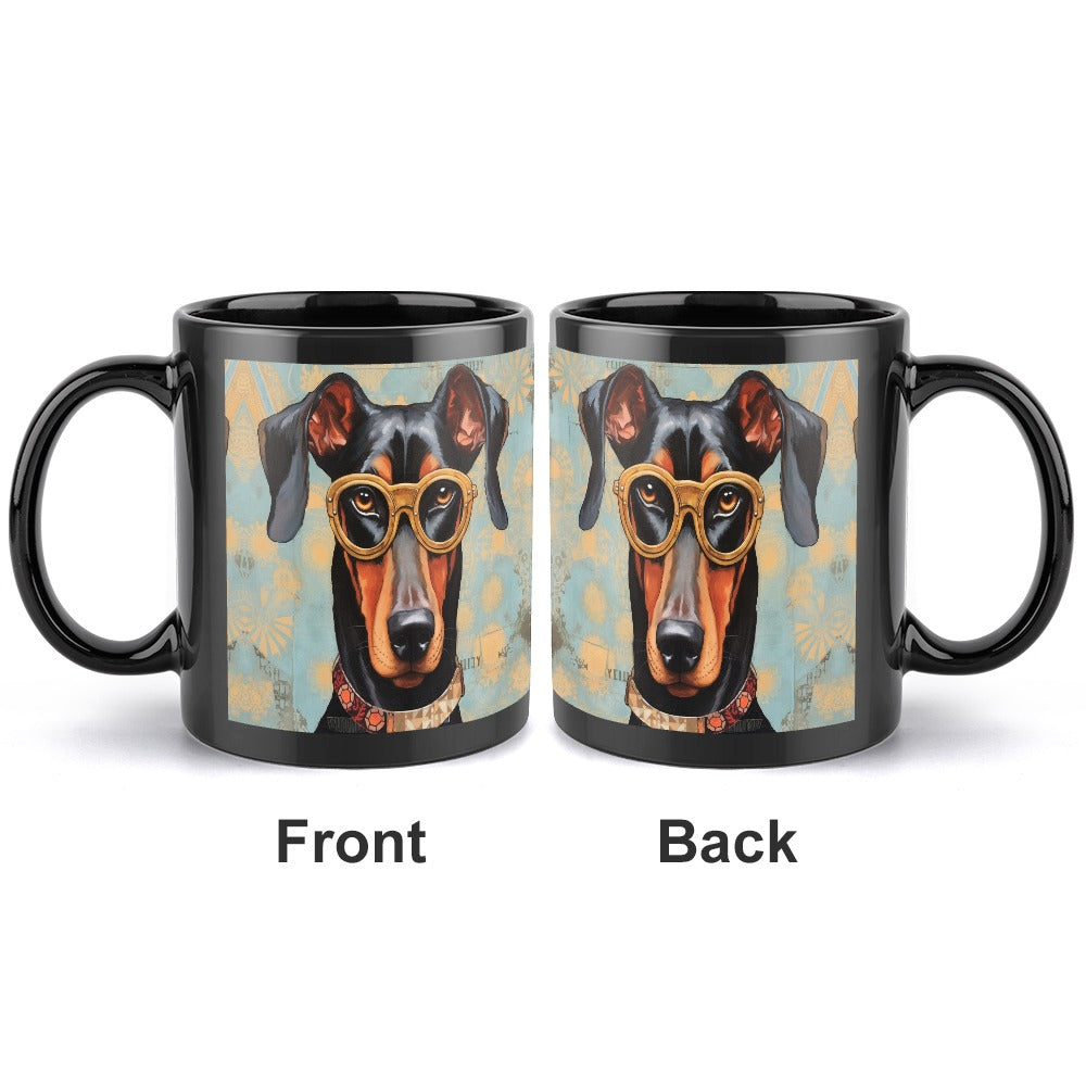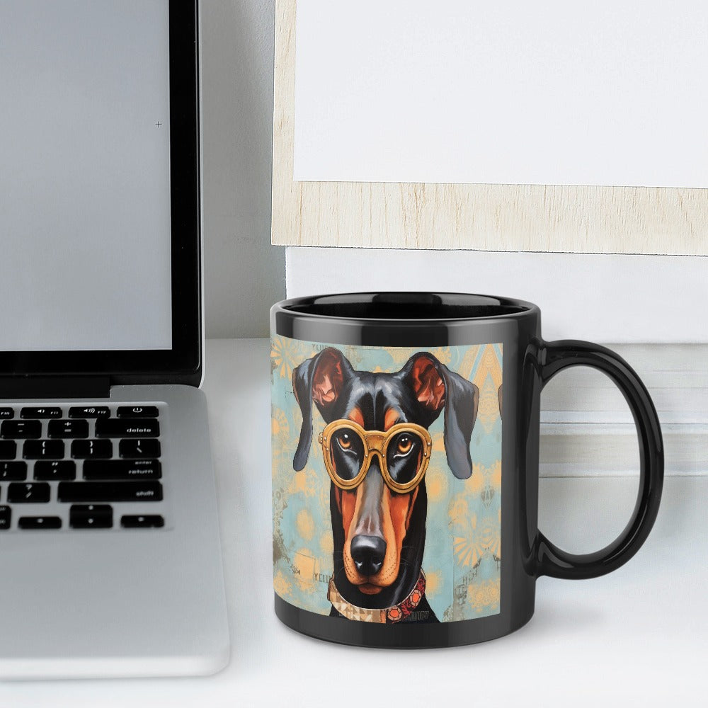 Featuring a noble Doberman adorned with vintage golden spectacles, this mug invites you to appreciate the breed's depth of character. The warm colors and intricate patterns enhance its thoughtful gaze, making it a perfect companion for your morning coffee or evening tea.