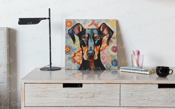 This exquisite piece of art captures the noble Doberman Pinscher, a breed renowned for its strength, loyalty, and commanding presence, set against an abstract, floral backdrop.