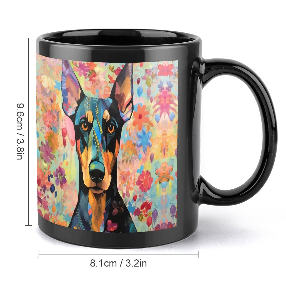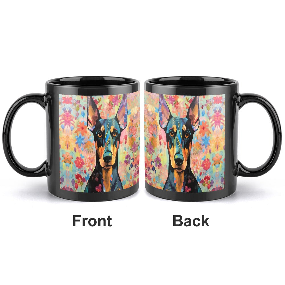 This high-quality ceramic mug features a stunning portrayal of a Doberman Pinscher, showcasing its strength and loyalty against a vibrant floral backdrop.