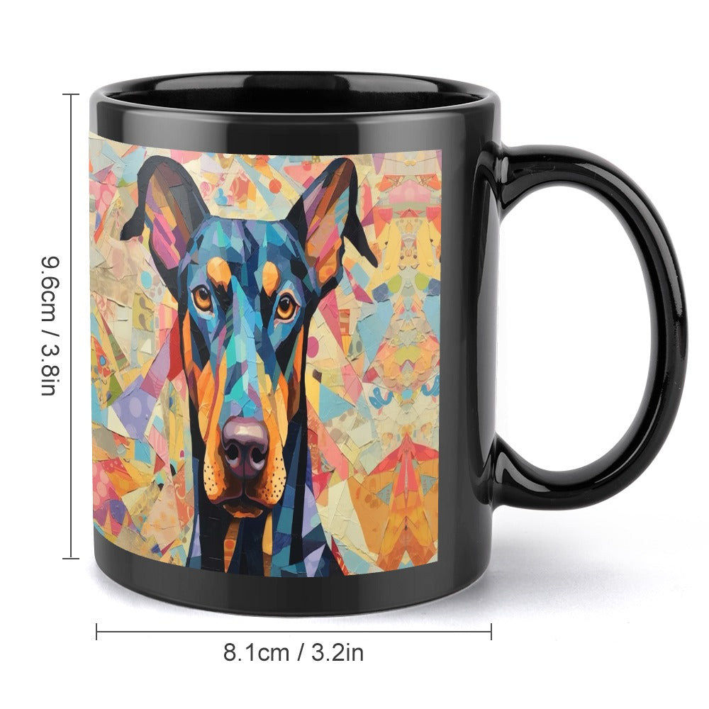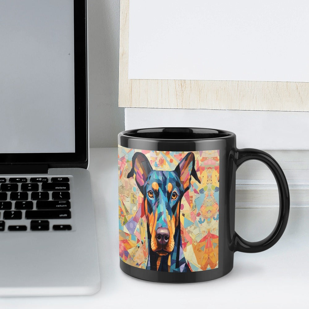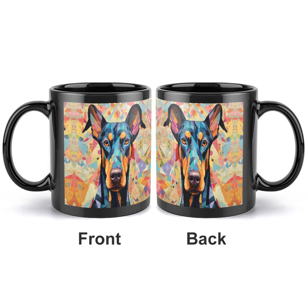 This vibrant mug captures the essence of the Doberman Pinscher, showcasing its iconic silhouette in a kaleidoscope of colors and shapes.