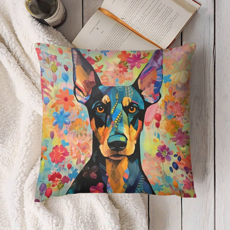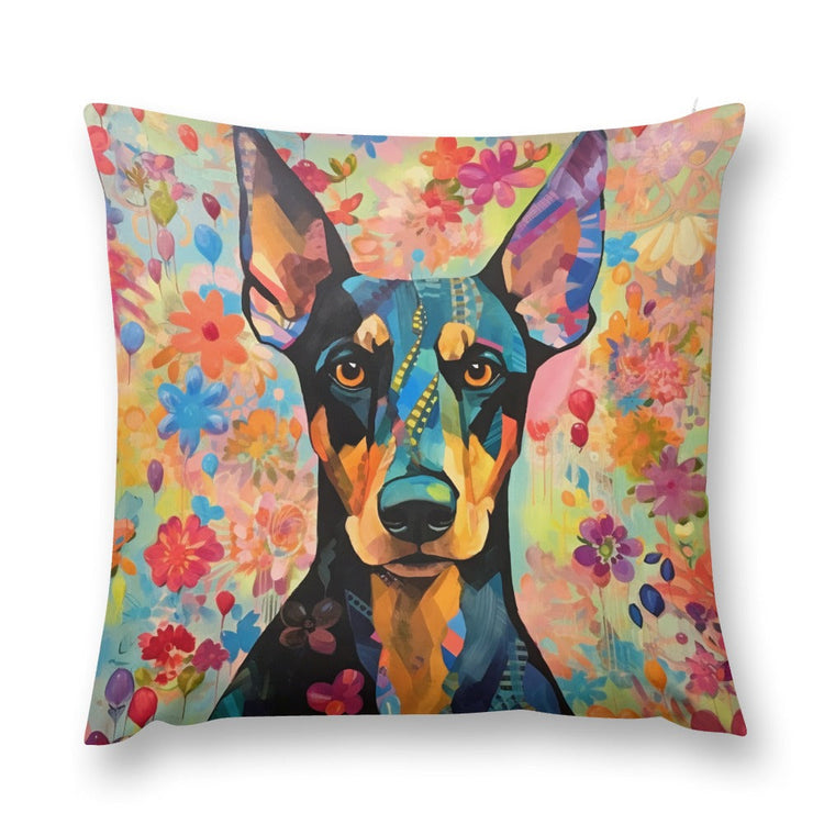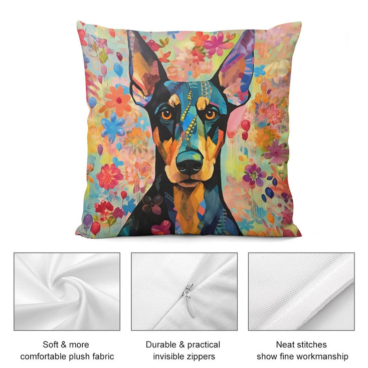 A masterpiece that contrasts the muscular form of the Doberman Pinscher against an abstract, floral tapestry, this plush pillow case brings a spectrum of colors into your home.