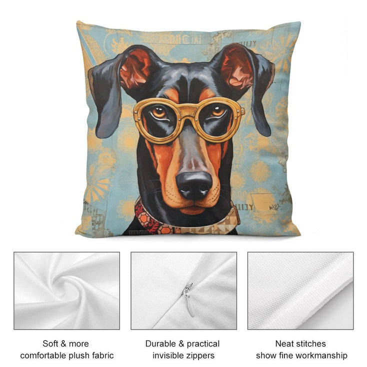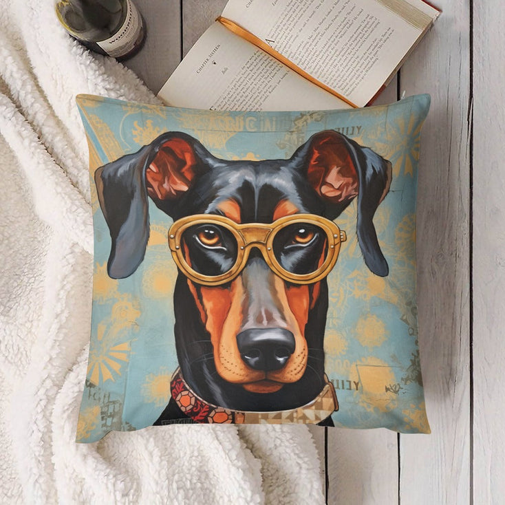 Crafted to capture the essence of the Doberman's wisdom and vigilant nature, this pillow case features a whimsical portrayal of a Doberman adorned with vintage-styled golden spectacles.