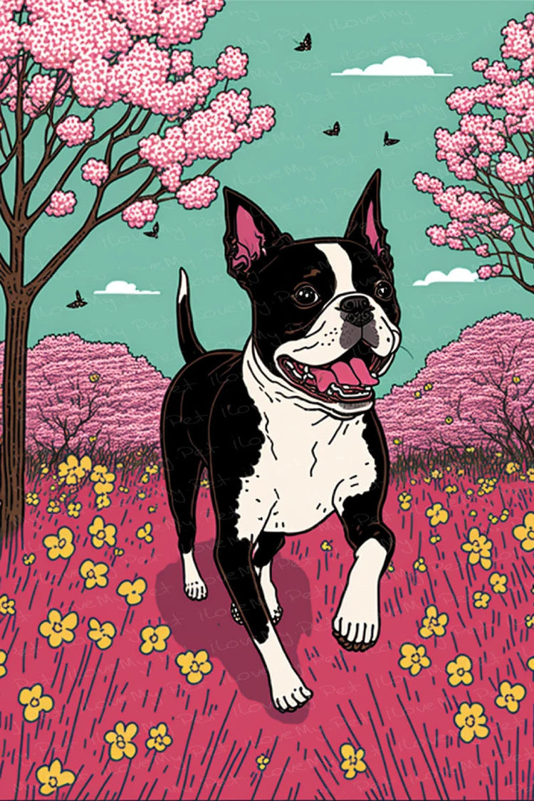 The poster features the Boston Terrier in its iconic black and white coloration, set against a whimsical backdrop of a field filled with cherry blossoms in full bloom. The pink hues of the flowers create a dreamy and serene atmosphere, perfectly complementing the dog's distinctive coat.
