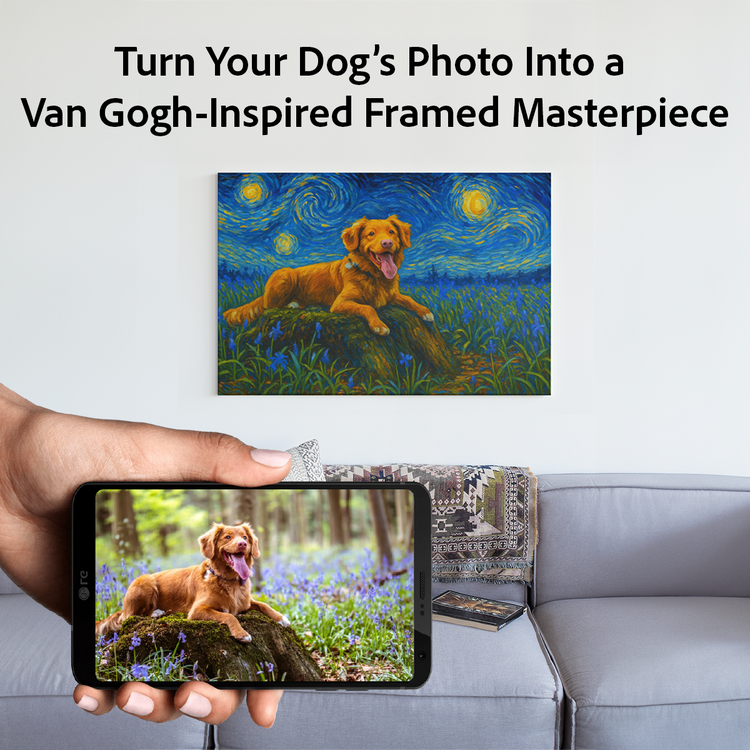 Transform your beloved dog’s photo into a stunning Van Gogh-inspired masterpiece that captures their spirit forever.